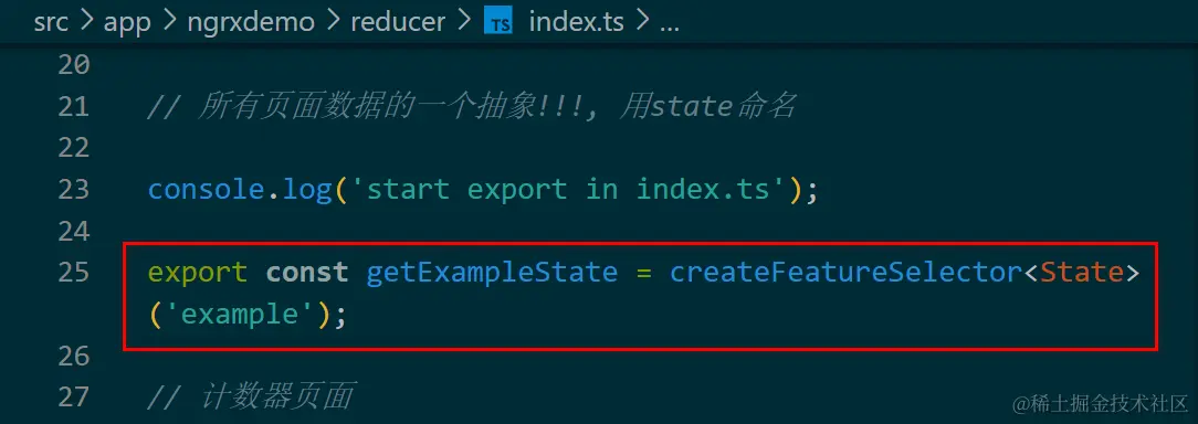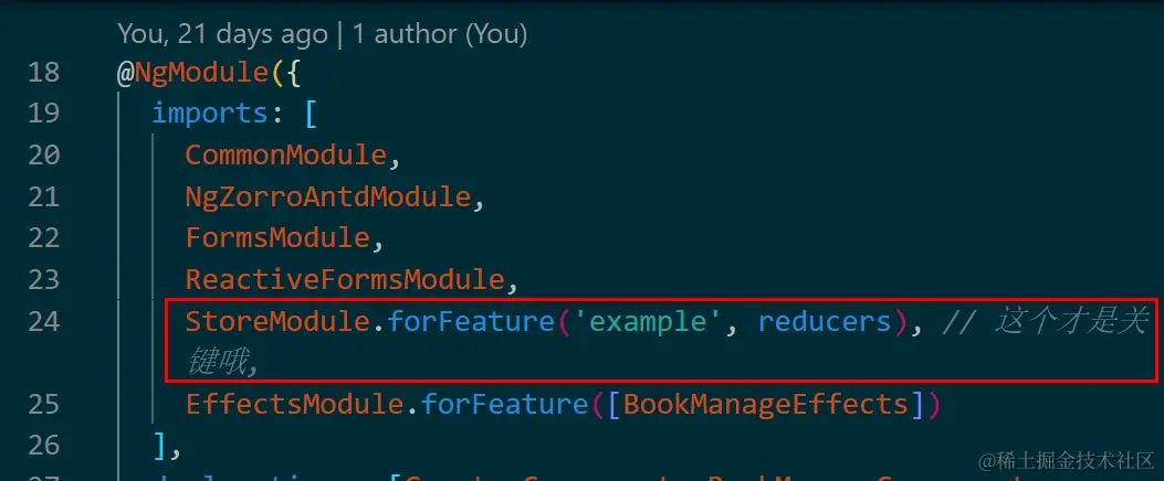 最后也是最重要的一步,一定要将feature selector同reducers通过StoreModule.forFeature建立绑定关系,下面24行意思是将我们自己实现的reducers注册到feature selector example上去。