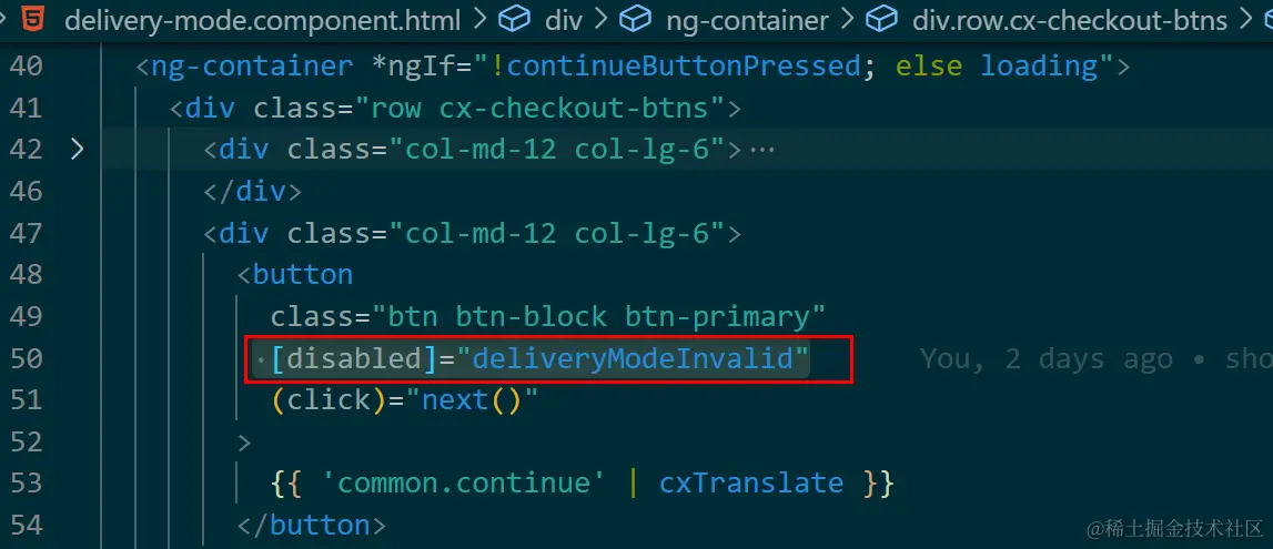 when component property deliveryModelnvalid = true, continue button’s disabled property will be set as true as well, so button is disabled, and vice versa.