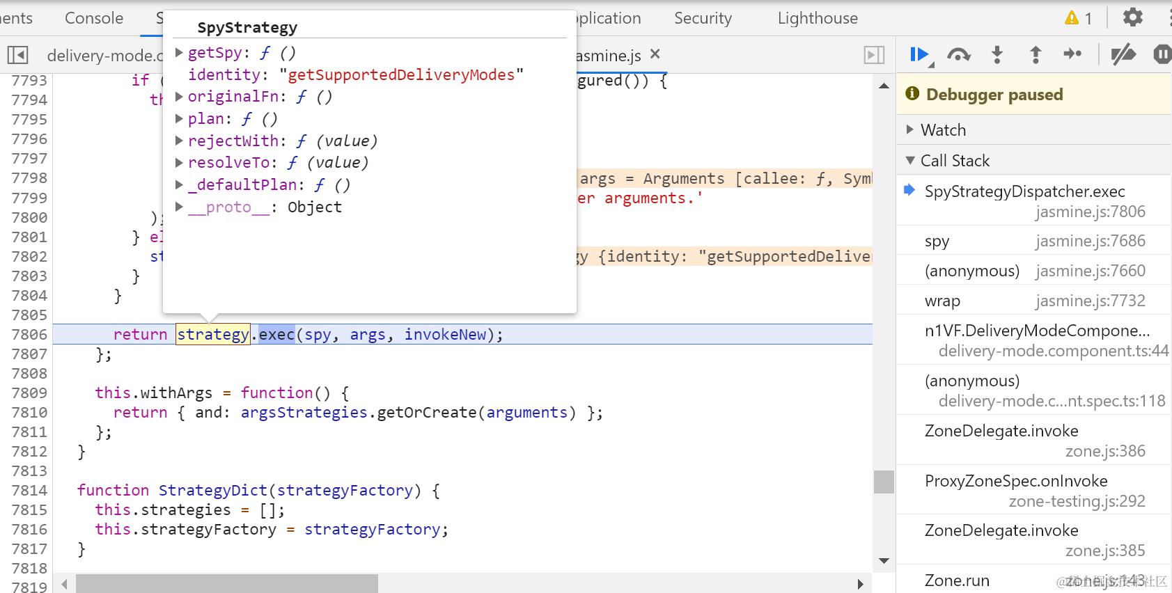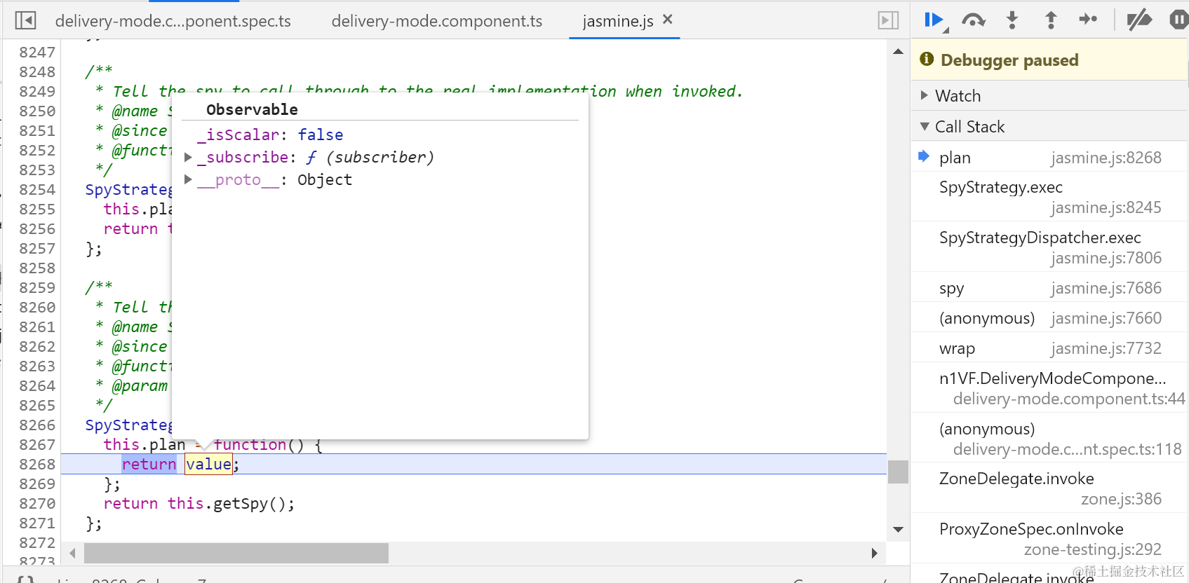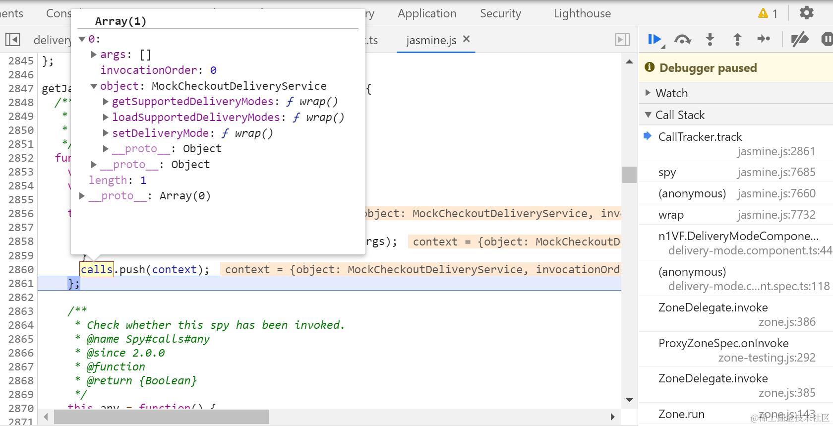 jasmine.spy对象的and.returnValue方法单步调试 已注销 2021-04-26 89 阅读1分钟 都已经是被spy之后的方法了: CallTracker.track就是把调用上下文放到一个calls数组里: delegate给strategy: 真正的执行体: 返回一个Observable对象: 最后拿到了mock data: 要获取更多Jerry的原创文章,请关注公众号"汪子熙":
