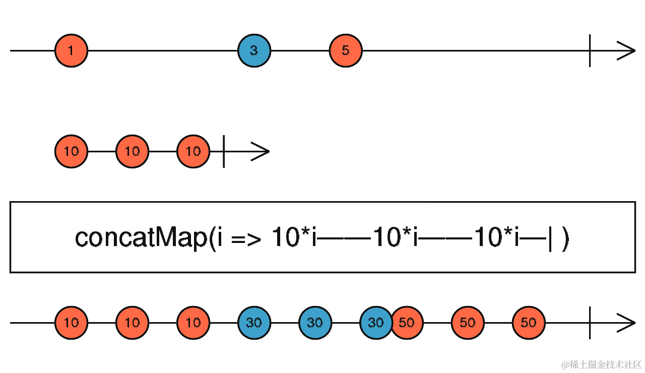 将source Observable里的每个元素施加一个projection函数,这个projection函数返回一个新的Observable,然后将所有这些Observable flatten成另一个Observable.