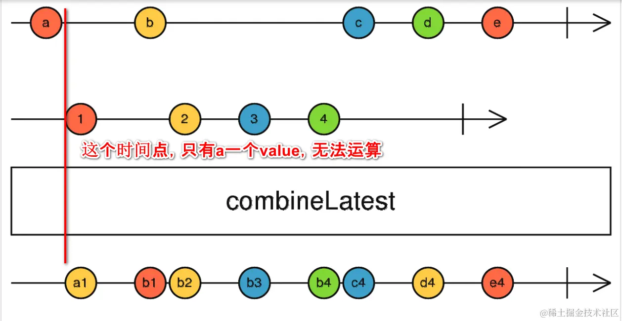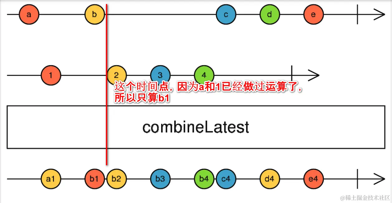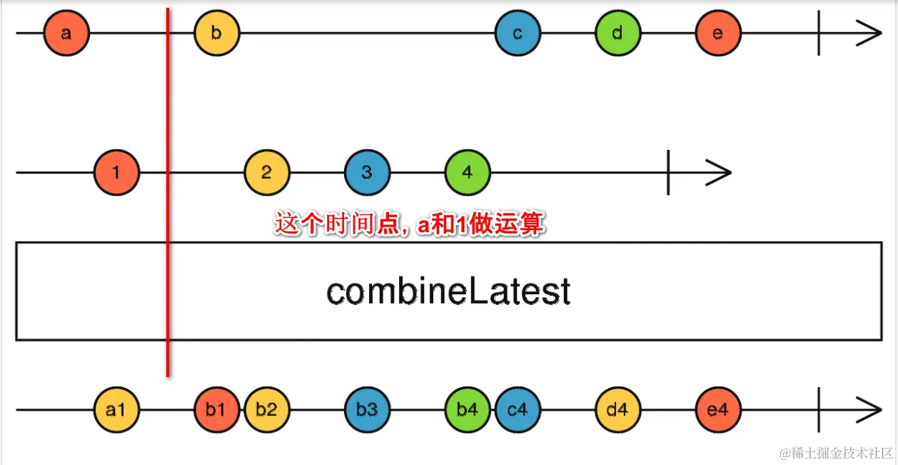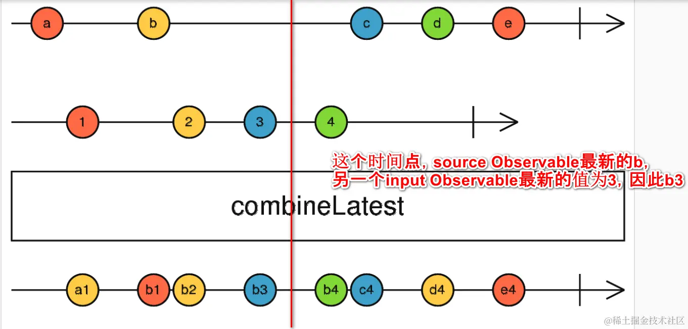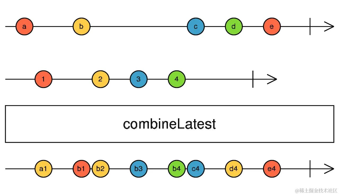 Whenever any input Observable emits a value, it computes a formula using the latest values from all the inputs, then emits the output of that formula.