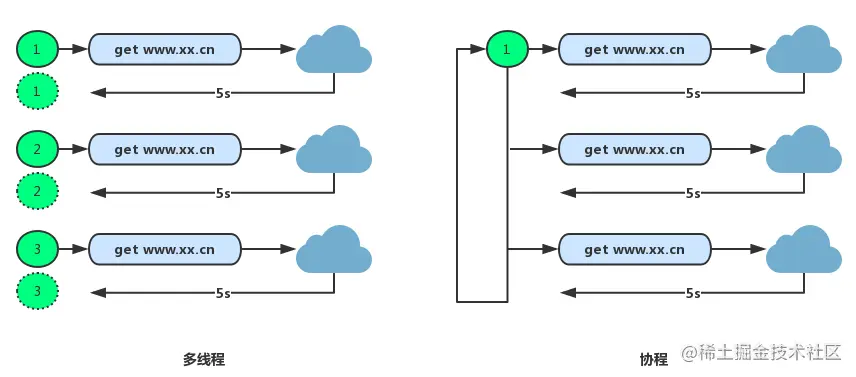 **总结:**协程的特点在于是一个线程执行,那和多线程比,协程有何优势?