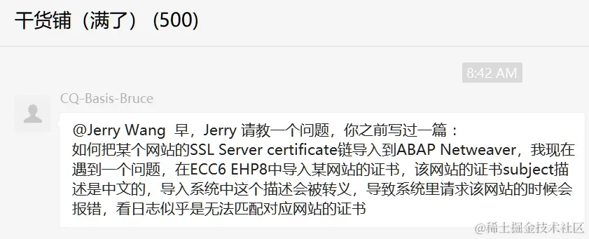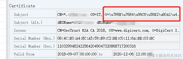 如何把某个网站的SSL Server certificate链导入到ABAP Netweaver,我现在遇到一个问题,在ECC6 EHP8中导入某网站的证书,该网站的证书subject描述是中文的,导入系统中这个描述会被转义,导致系统里请求该网站的时候会报错,看日志似乎是无法匹配对应网站的证书。