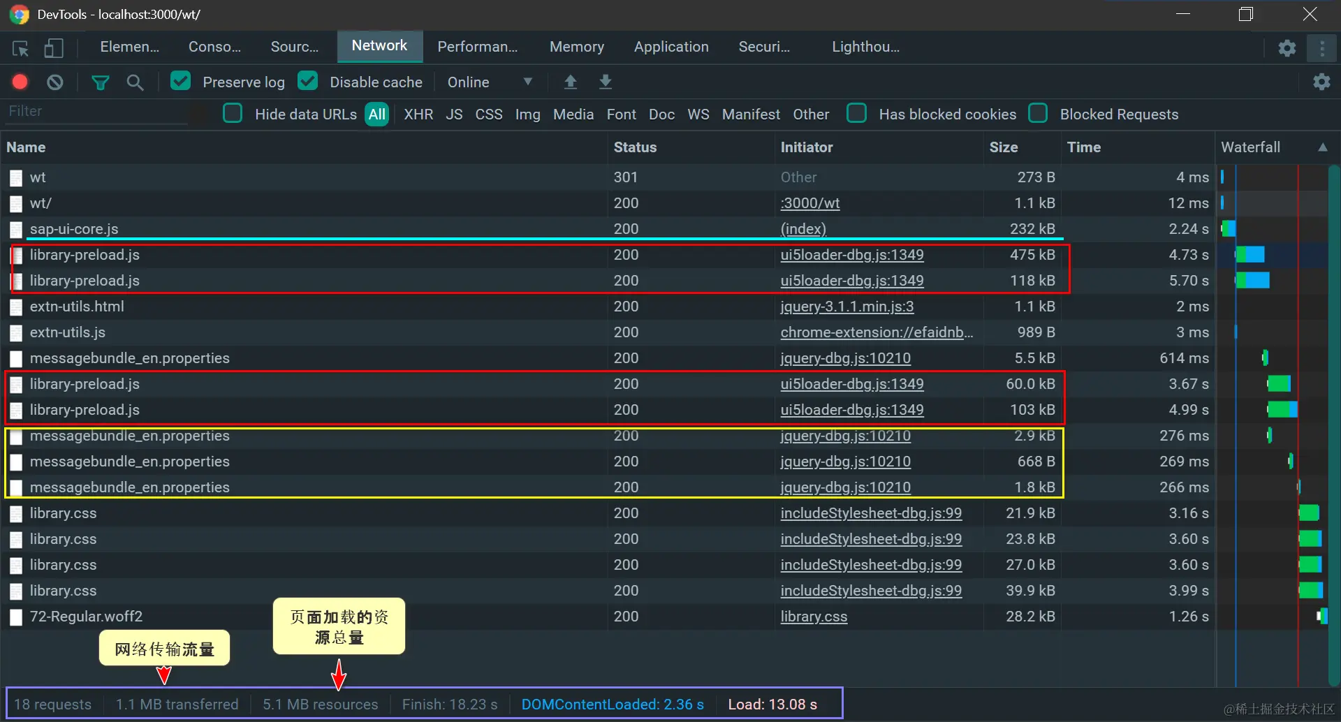 浏览器里打开,总共触发了18个请求,网络传输流量1.1MB, 页面总共加载了5.1MB资源(见下图底部紫色矩形框所示)。