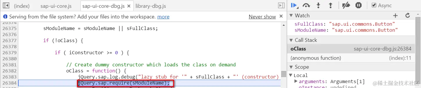 下图sap-ui-core-dbg.js第26384行就是Button Module的加载入口,注意注释里lazy stub for XXX的提示: