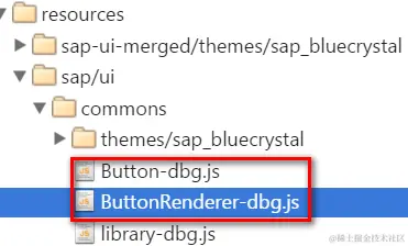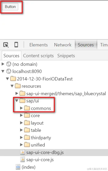 待button显示在页面之后,打开Chrome开发者工具Sources面板,能看到sap/ui文件夹下多出来一个commons文件夹: