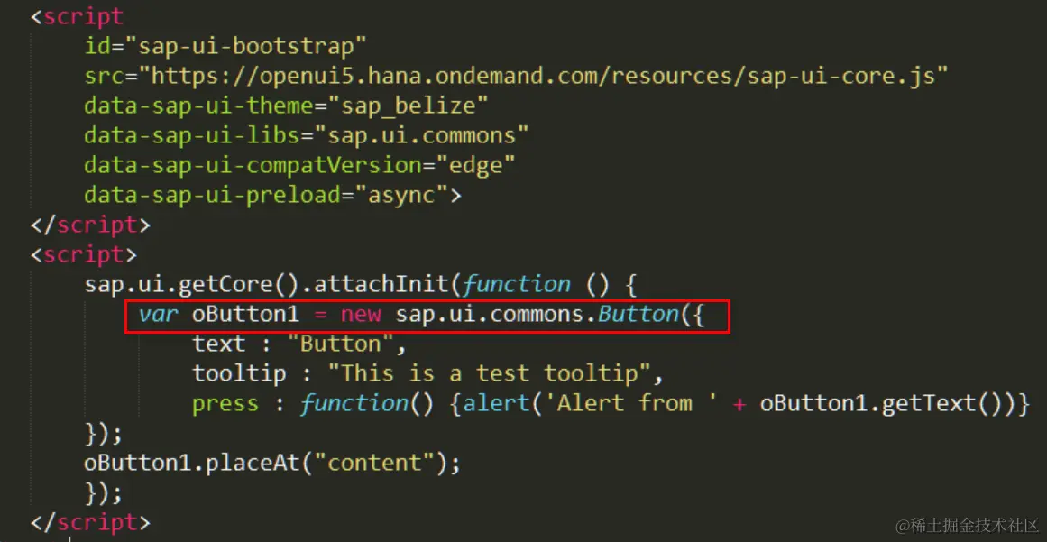 回忆一下我们的脚手架应用的代码里,新建了一个命名空间sap.ui.commons下的Button控件实例: