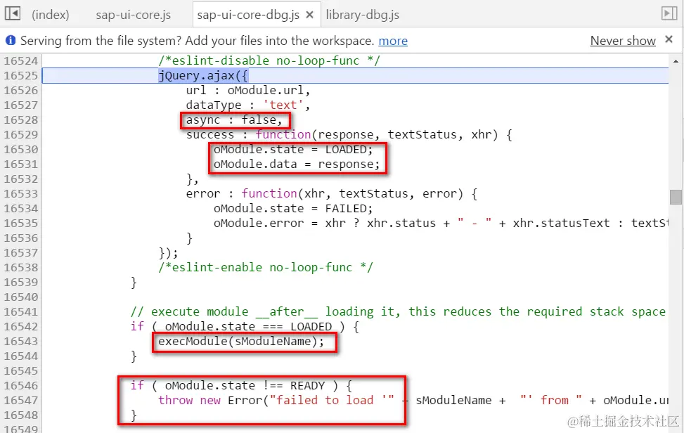 因为该Module若不加载完成,则我们代码里的new sap.ui.commons.Button无法继续下去,因此这里的AJAX调用以同步模式进行( async = false ). 在其成功加载的回调函数里,将Module状态设置为LOADED, response变量包含的就是Button-dbg.js的文本内容。