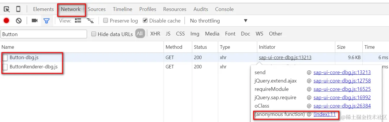 切换到Network标签页,选择任意一个Button Module加载的网络请求,把鼠标hover到Initiator列上,在弹出窗口就能看到一个调用栈,从中就能观察到是index.html即Button控件的消费者,触发了这两个Button Module的加载。