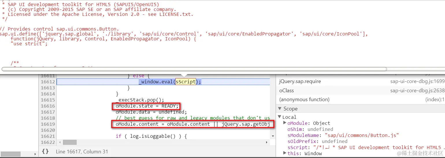 代码第16612,如调试器所示:变量sScript包含的就是Button-dbg.js的文本内容,待window.eval()执行完毕后,Module的状态设置为READY: