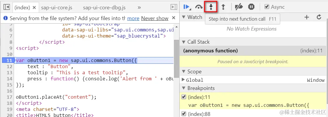 在index.html里实例化Button控件的代码处设置断点,重新刷新应用。因为sap.ui.commons.Button并不是原生的HTML element,所以调试器执行到代码第11行并且单步执行后,会触发Button Module的加载: