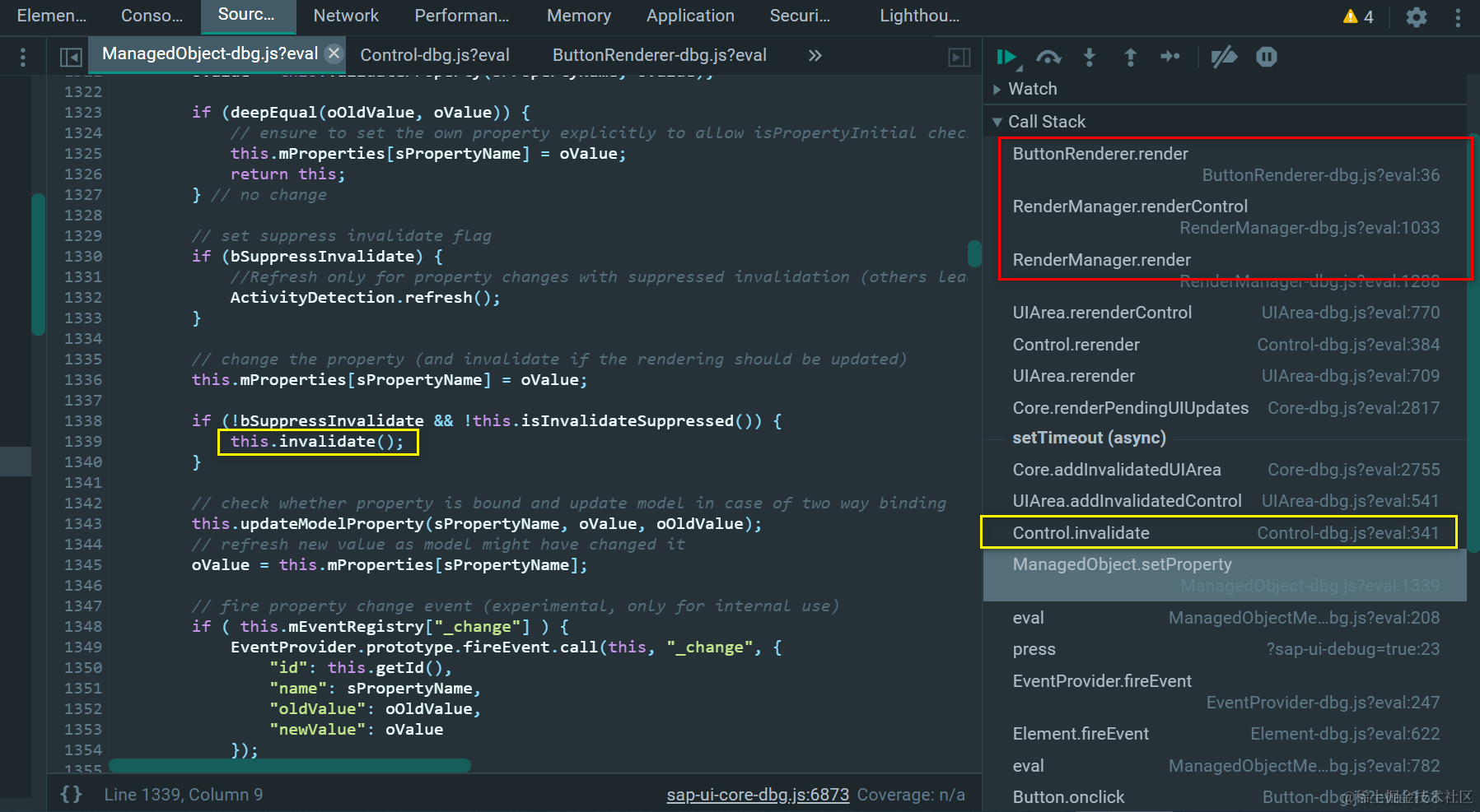 原因在于,oButton1.setText最终会调用button原型链上的ManagedObject.setProperty方法,该方法内部有一个显式的invalidate调用。
