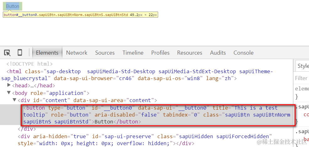 使用Jerry的文章 一个用于SAP UI5学习的脚手架应用,没有任何后台API的依赖,创建一个只包含一个button控件的SAP UI5应用,用Chrome开发者工具里的Elements工具栏查看该button控件的原生HTML代码: