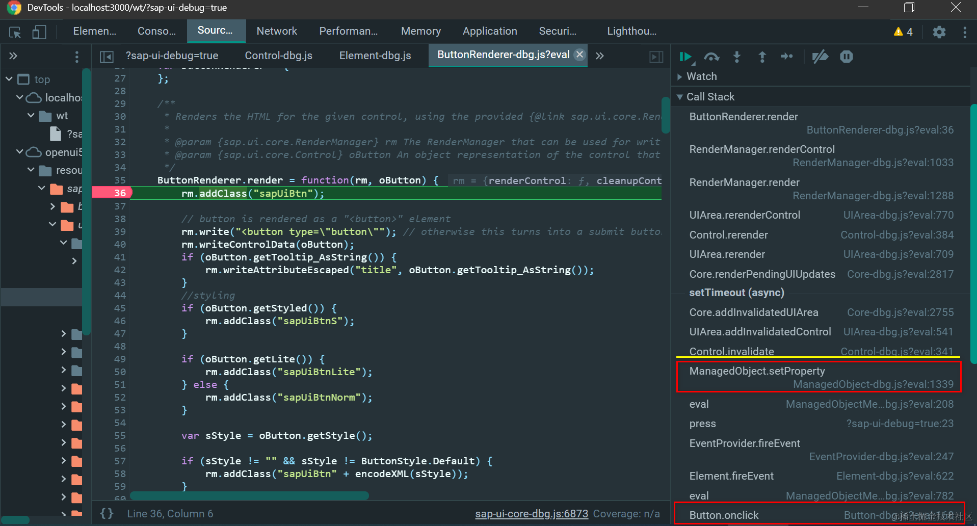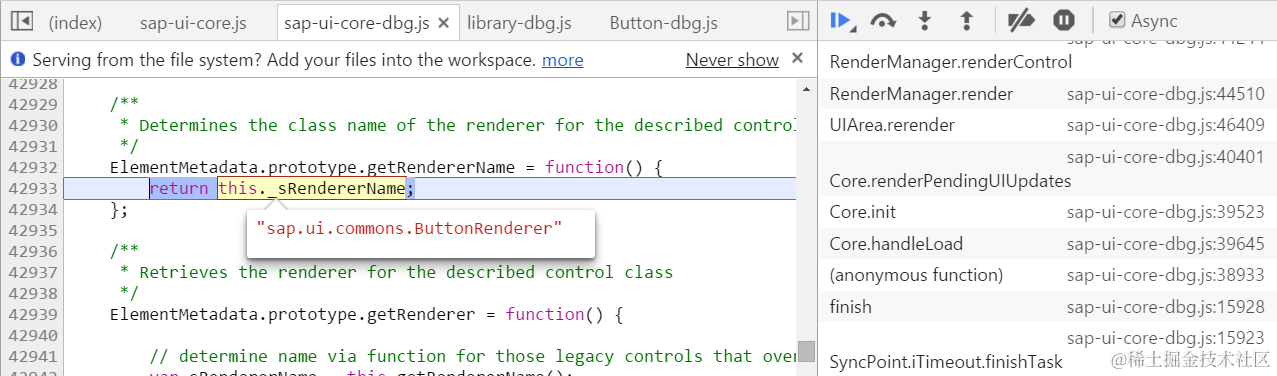 在ButtonRenderer.render函数里设置断点,然后F5刷新页面,断点触发,就可从调用栈观察到RenderManager是如何调用ButtonRenderer执行渲染工作的。