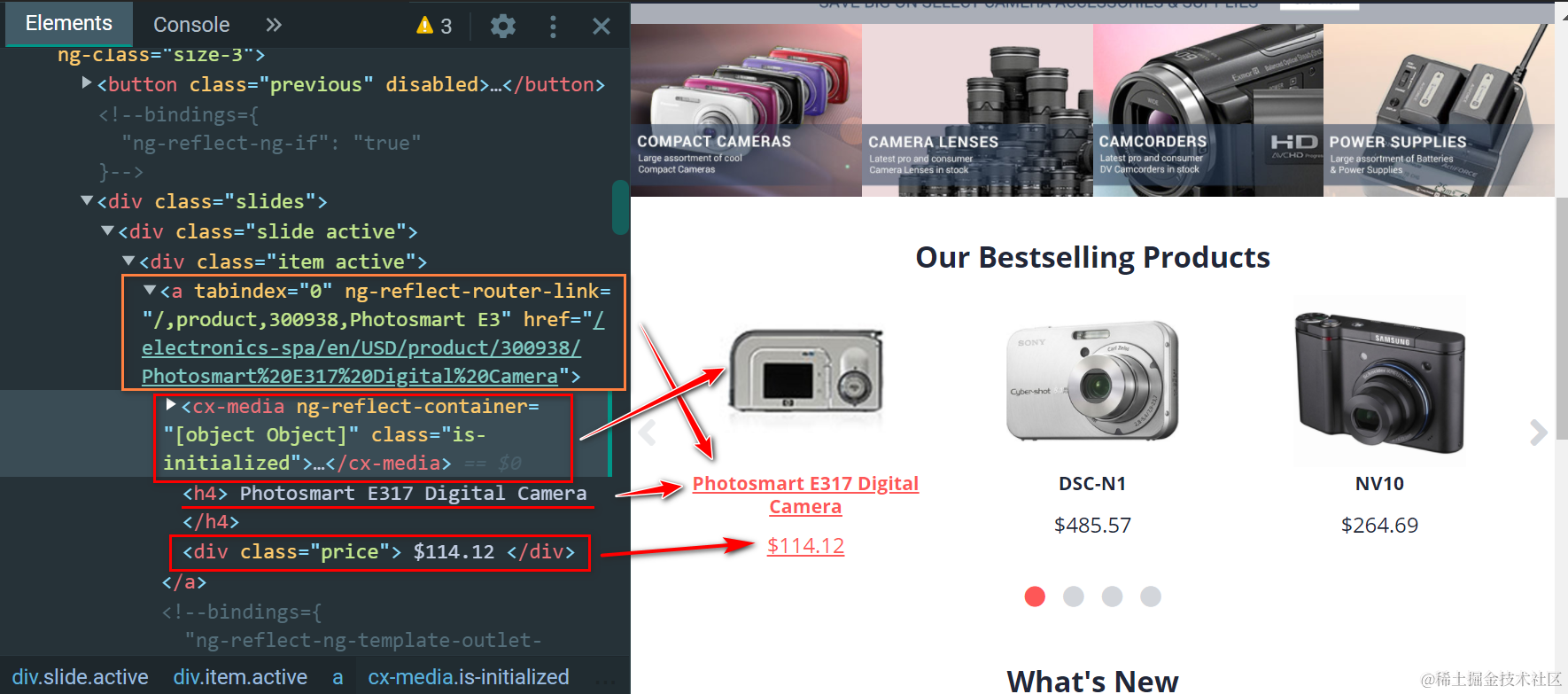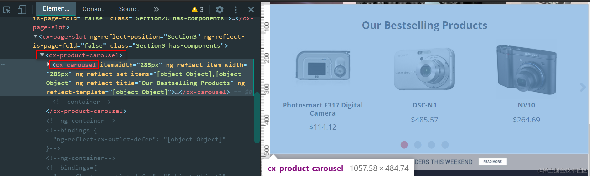 Spartacus产品转盘控件的HTML代码表现形式为标签cx-product-carousel,内部重用了另一个自定义标签cx-carousel: