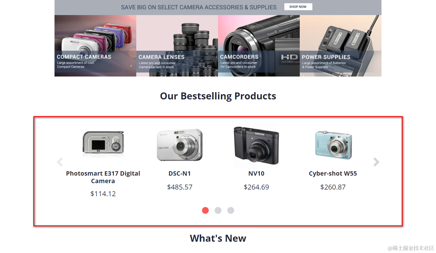 我们再来简单了解下Angular里的控件绘制。以SAP Spartacus的产品转盘(Product Carousel)显示控件为例: 最畅销的产品共有12款,分多屏显示在转盘控件里,每屏显示若干个产品。通过控件提供的左右箭头,进行屏与屏之间的切换。转盘底部的小红点,表示当前转盘显示的是第几个屏幕的数据。
