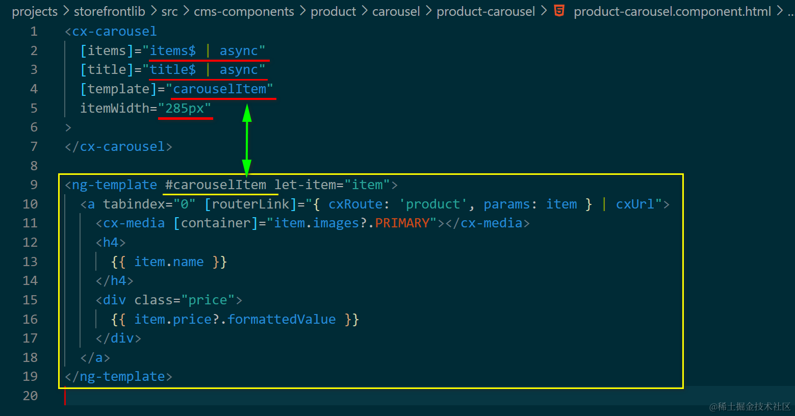 因为cx-carousel是一个可重用控件,除了显示产品转盘外,还可以用于显示其他同类实体的转盘显示,比如折扣转盘,促销活动转盘等等。因此,除了将items 和 t i t l e 和title 和title传入cx-carousel之外,还需要告知后者,在转盘内部,以何种布局逻辑显示转盘的每一个元素。
