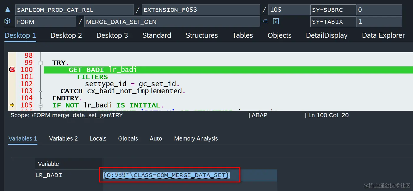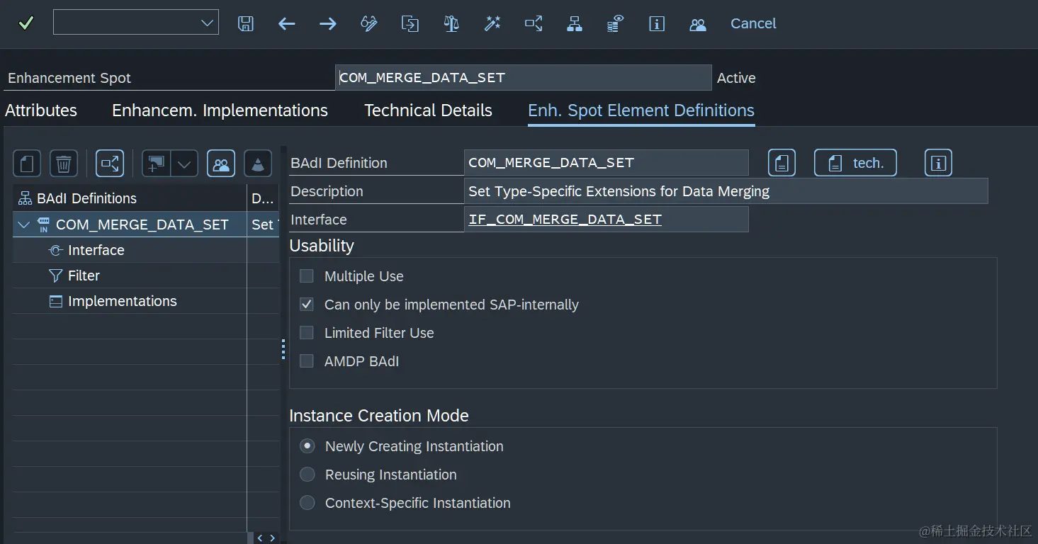 如果断点停下来,双击GET BADI后的变量lr_badi, 把名称COM_MERGE_DATA_SET抄下来,这就是SE18里Enhancement Spot的BAdI定义名称。