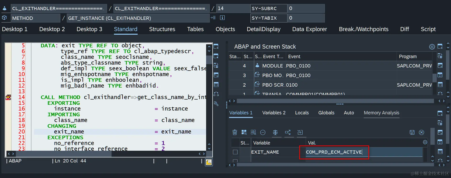 在CL_EXITHANDLER的GET_INSTANCE方法里设置断点,然后重新运行程序,如果断点触发,就把变量exit_name的值抄下来: