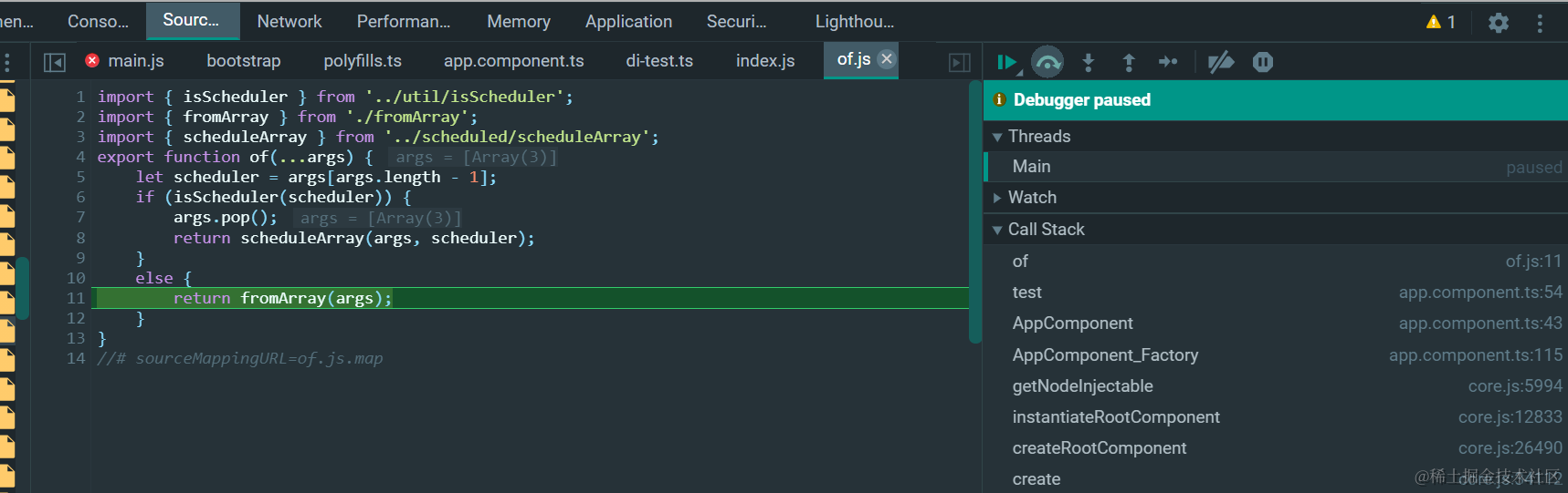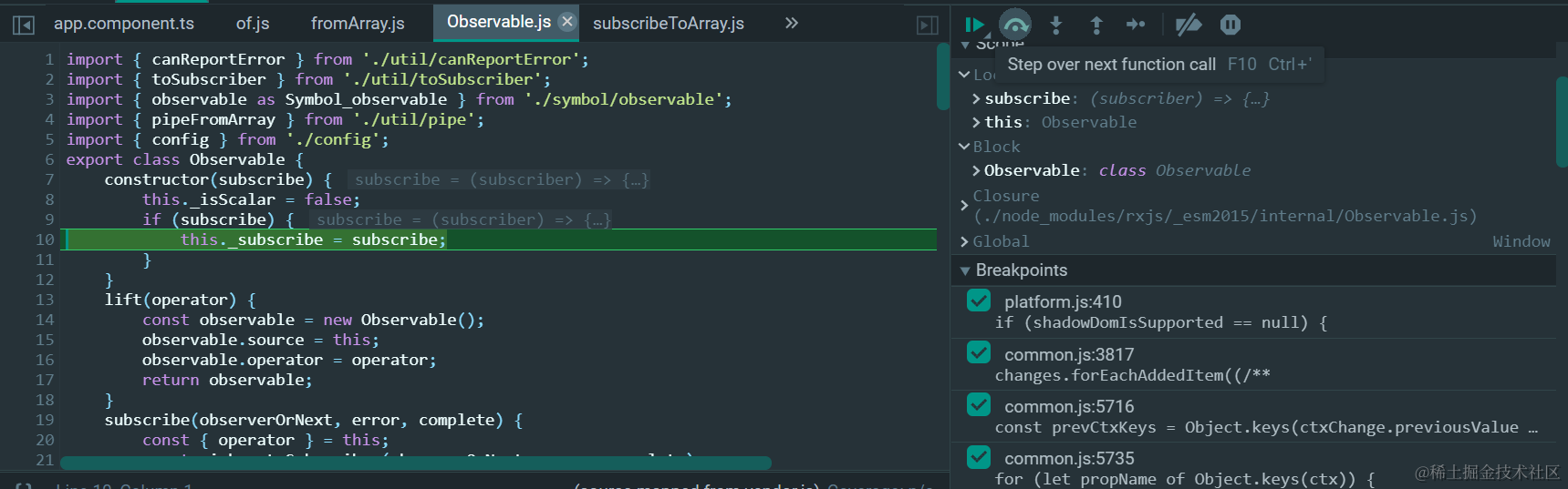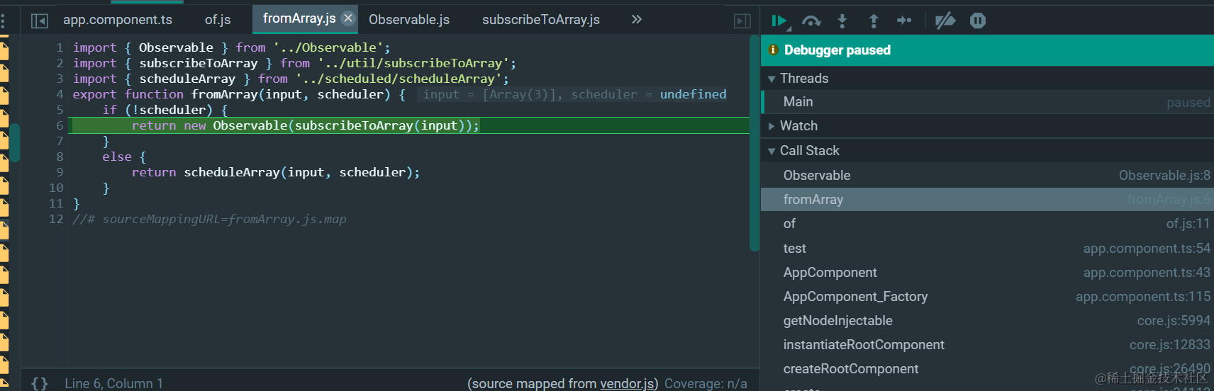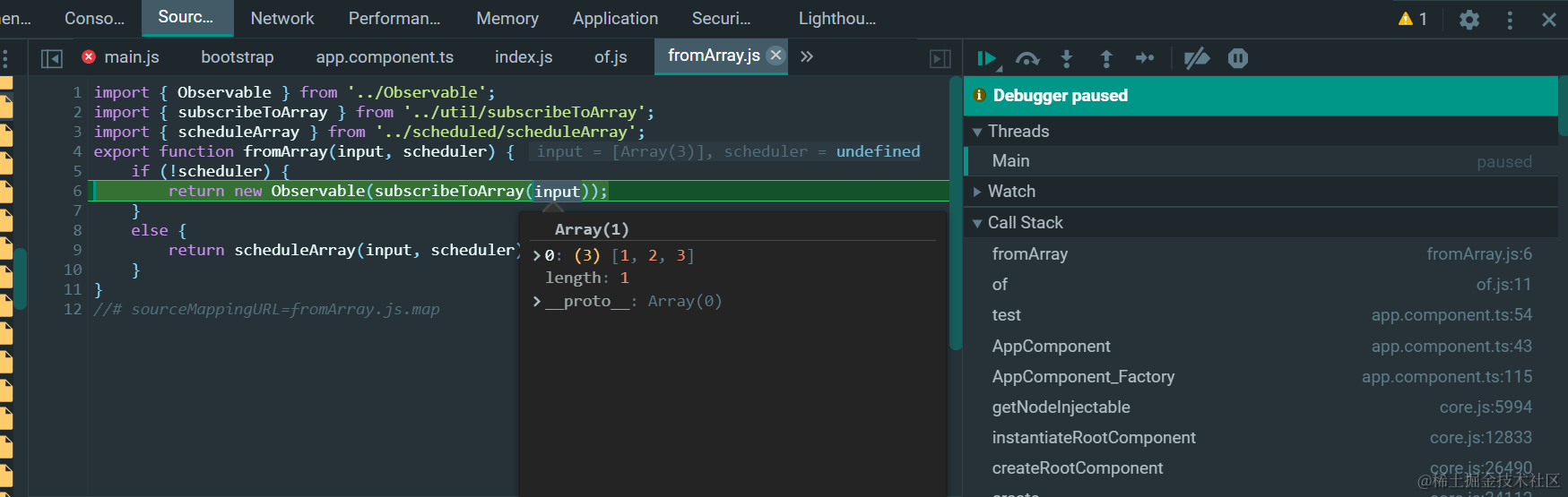Observable构造函数接收一个函数作为subscribe的回调函数。我们这个例子,subscribe回调函数通过subscribeToArray构造: