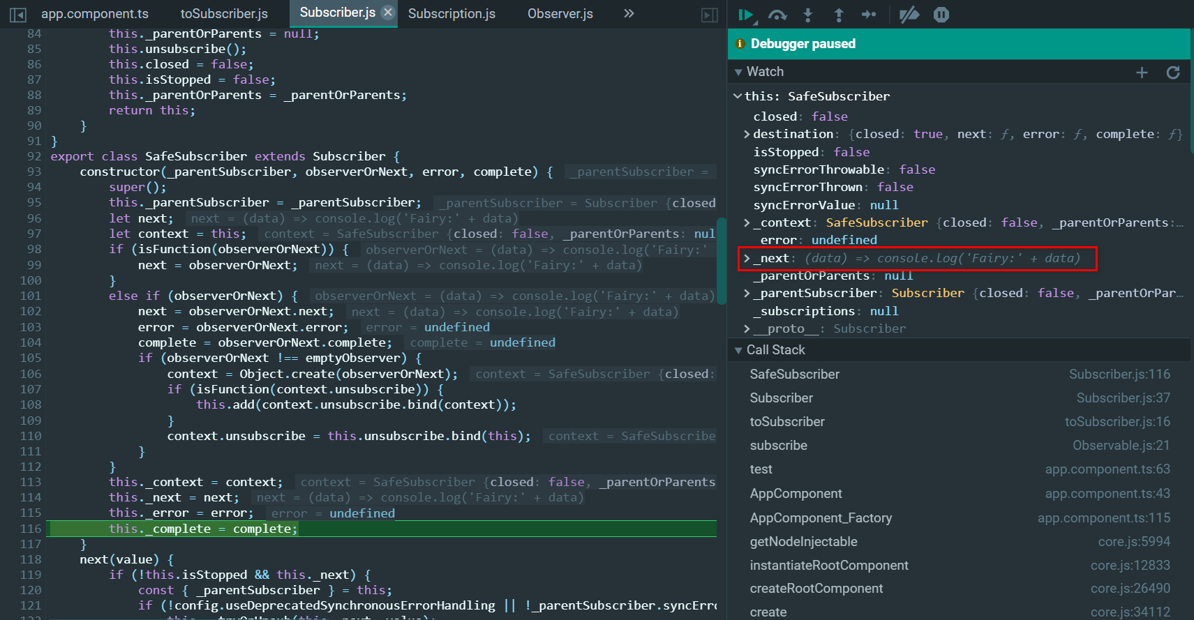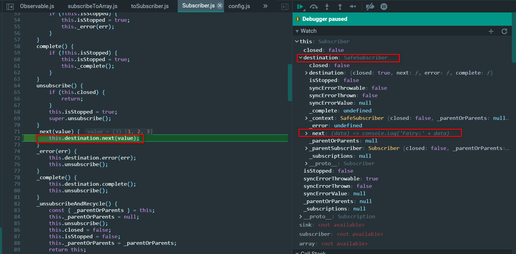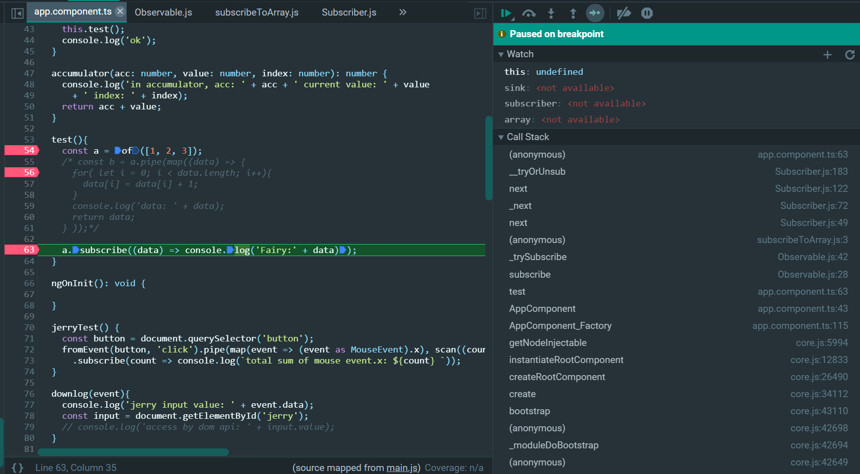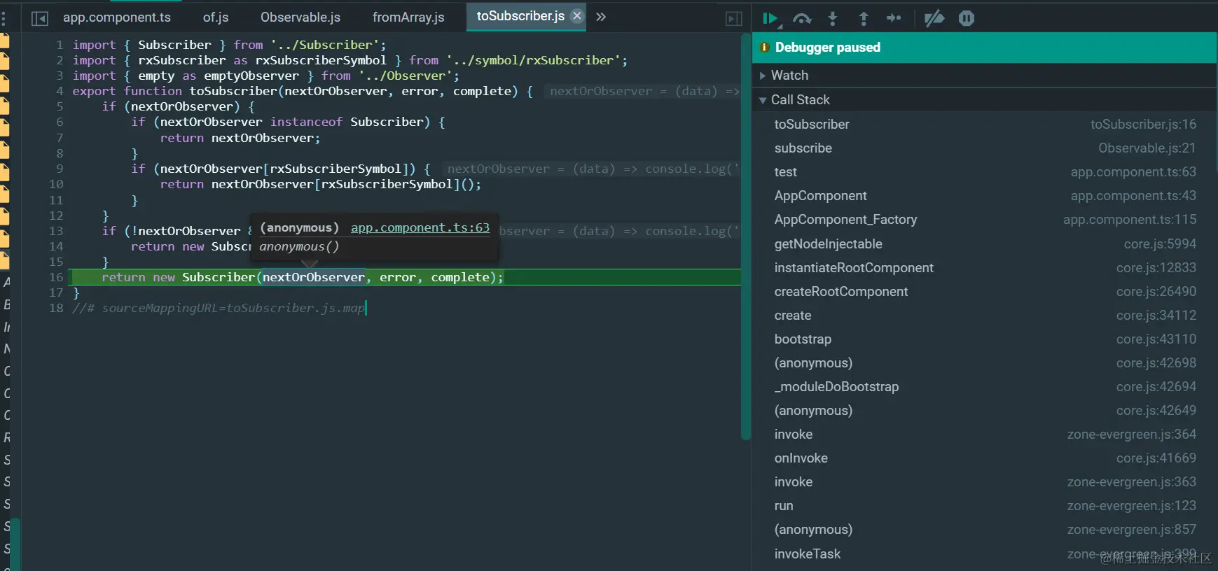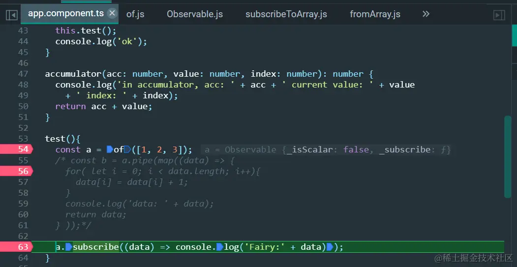 ObserverOrNext就是上图第63行的箭头函数,error和complete为undefined: