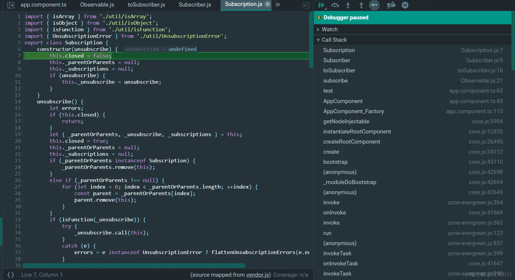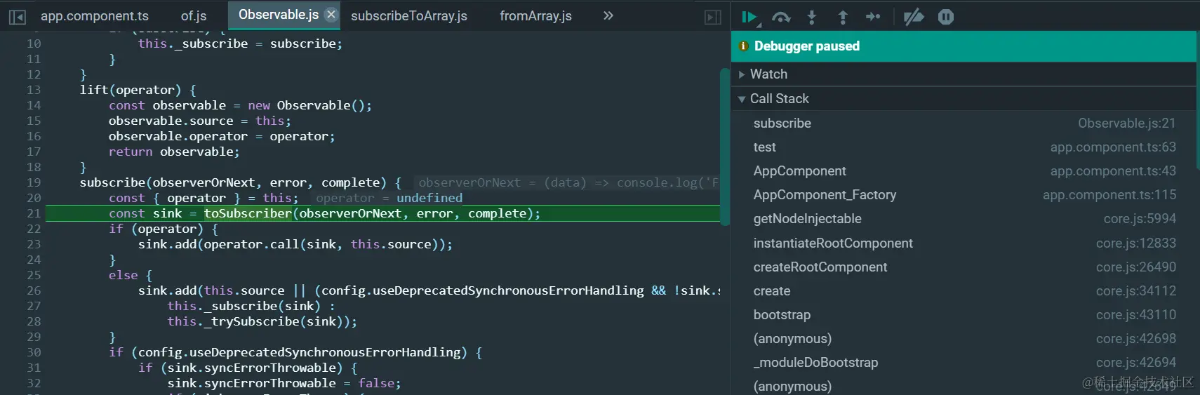 然后就执行到了之前用subscribeToArray返回的function内部: