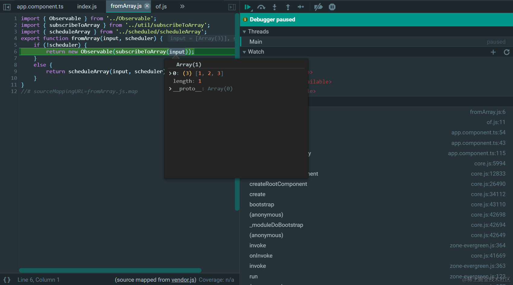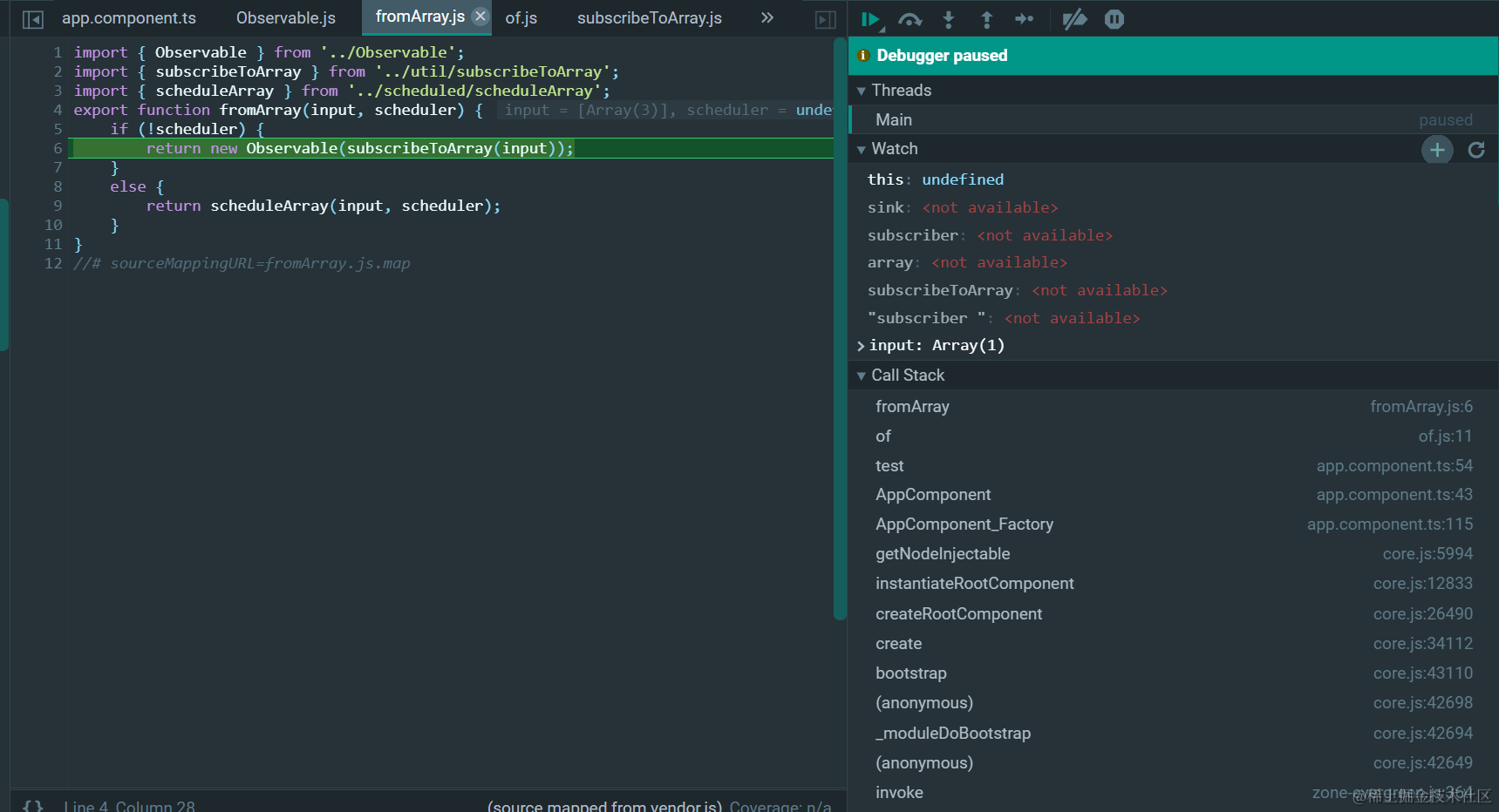 rxjs 里的subscribeToArray.js 已注销 2021-04-26 85 阅读1分钟 只有调用函数subscribeToArray的上下文,才知道array的内容到底是什么。 调用上下文,只有一个参数input传给了subscribeToArray: 因此只有在Observable构造函数里,才能打印出input的真实数据: 更多Jerry的原创文章,尽在:“汪子熙”:
