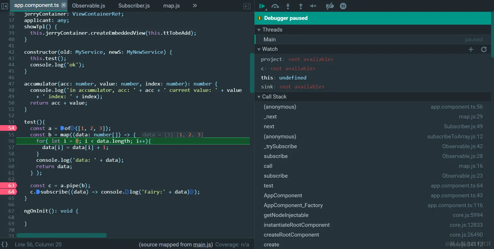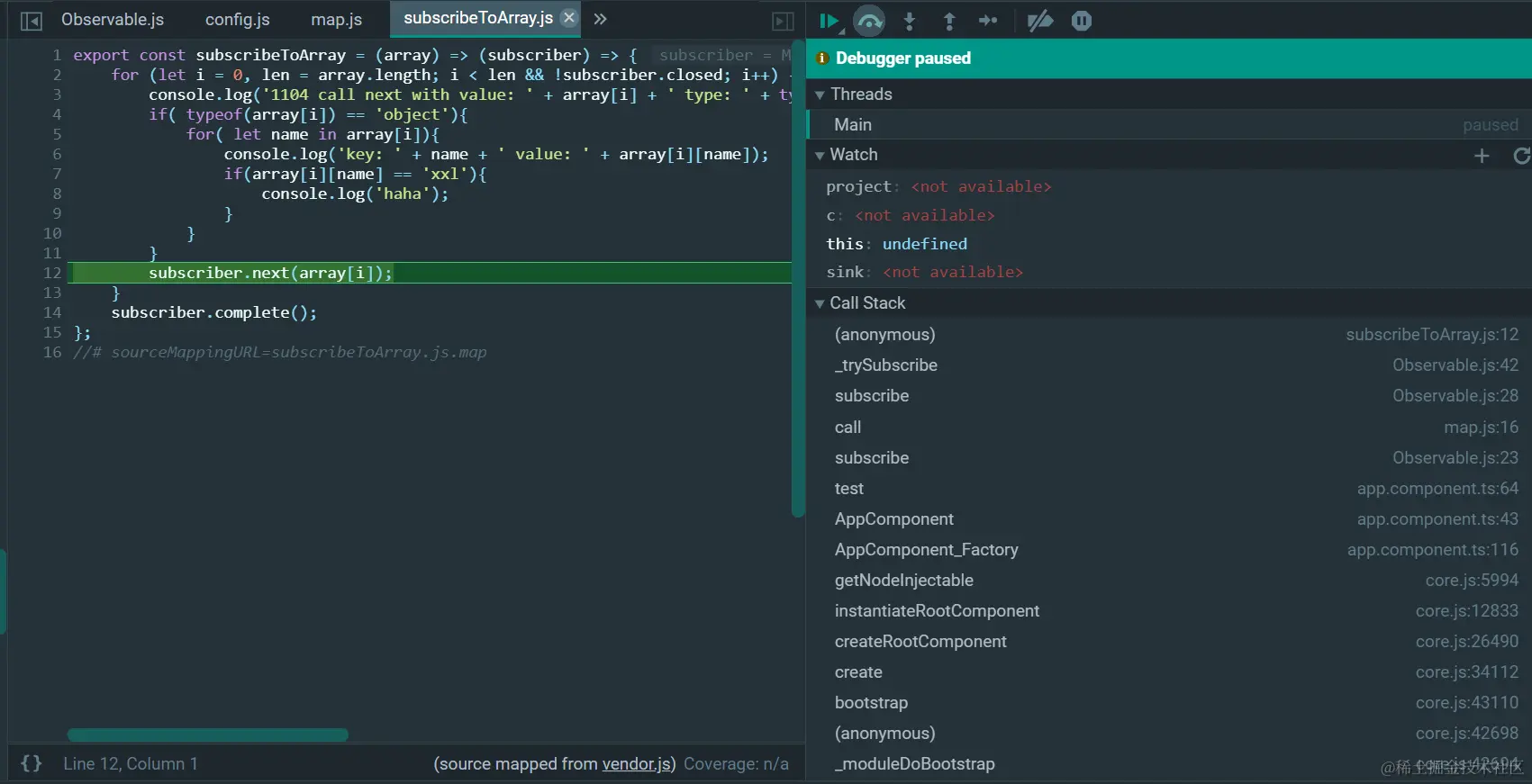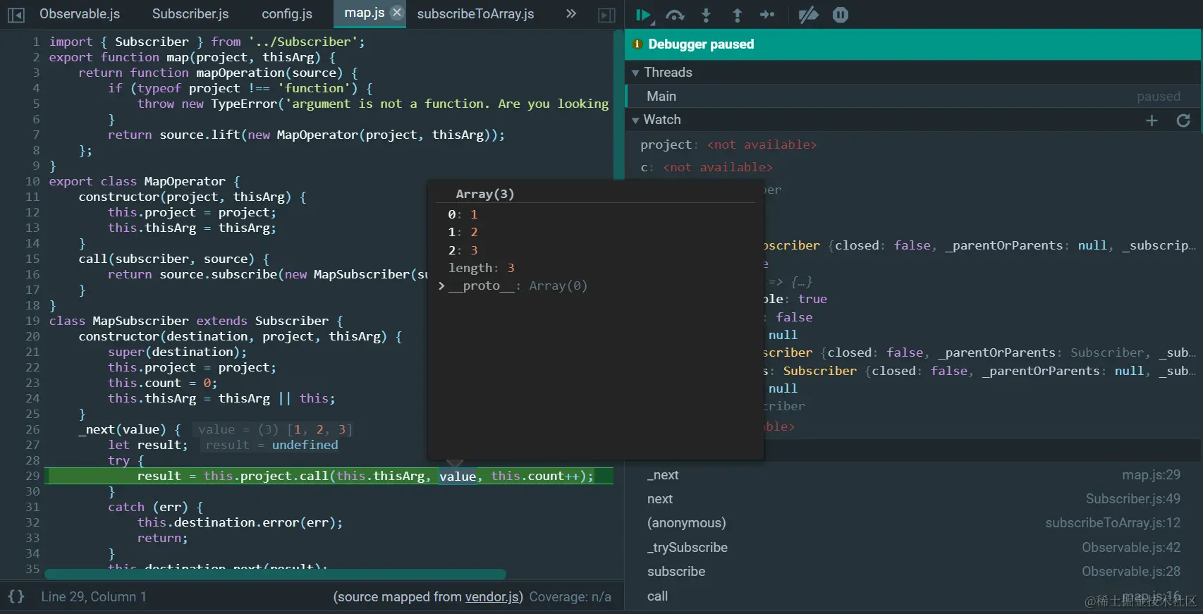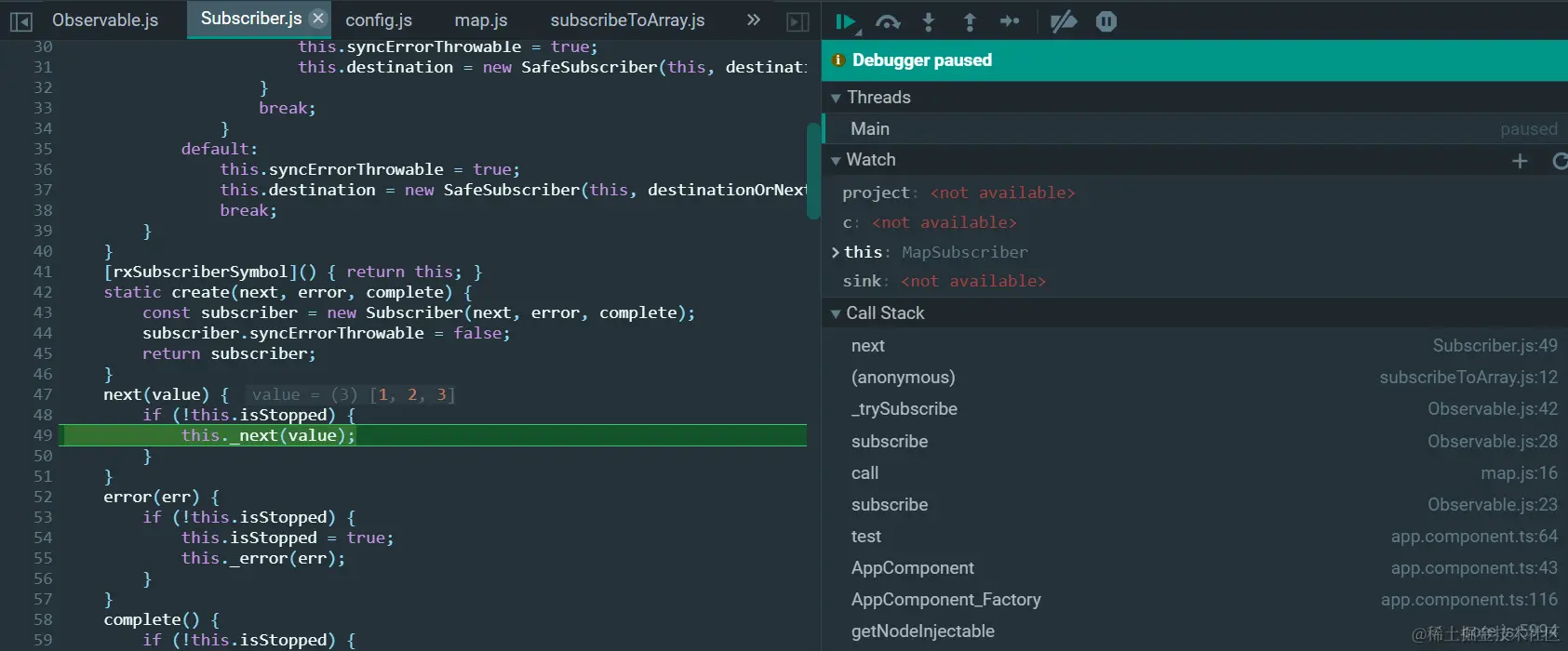 of返回的原始Observable调用subscribe方法,里面会调用subscriber的next方法,输入为[1,2,3]: