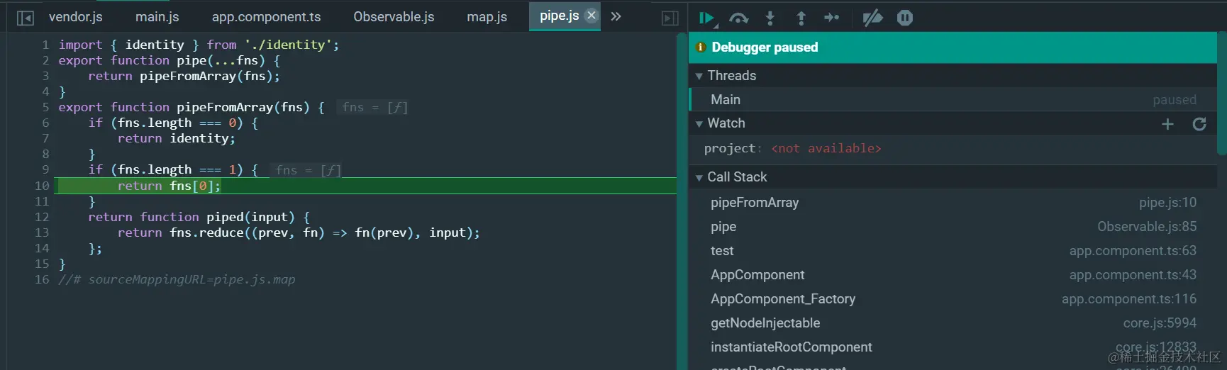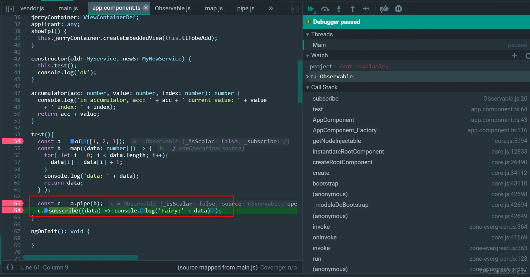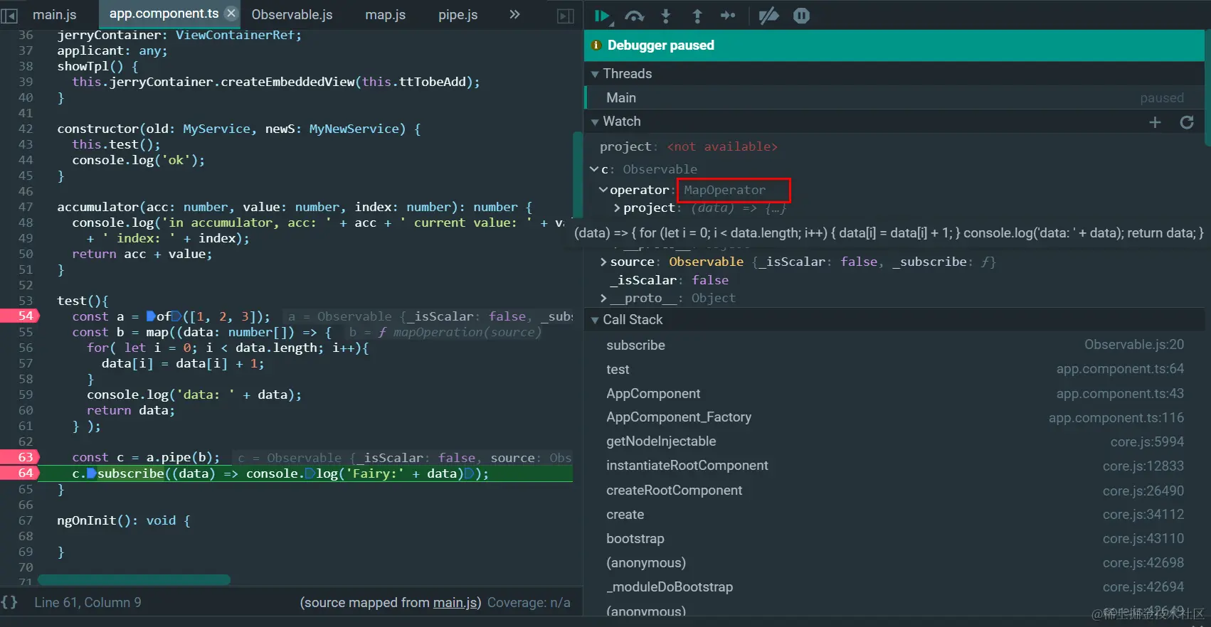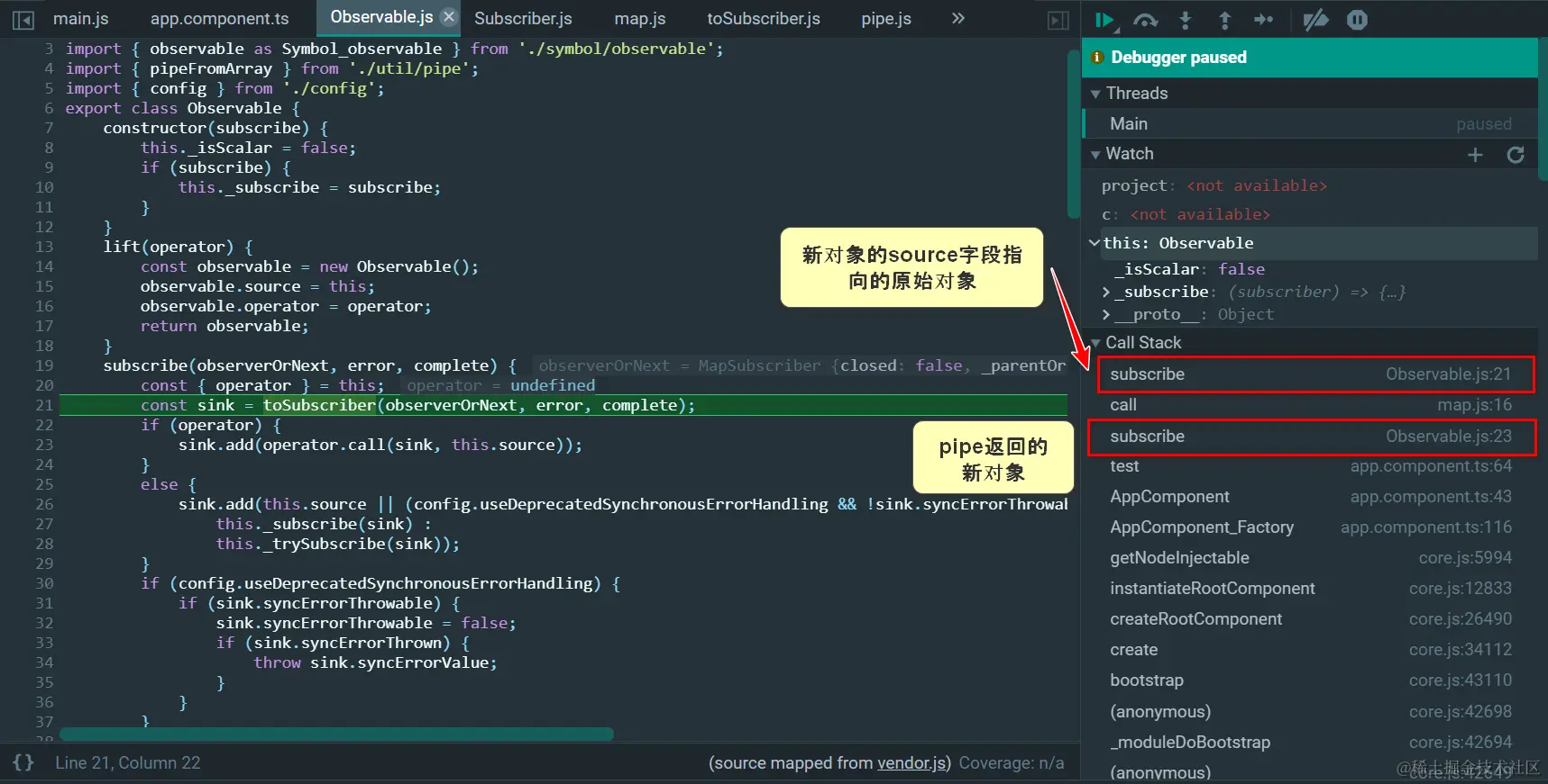 注意,此时我们执行subscribe的Observable对象,实际上是pipe操作返回的新Observable: