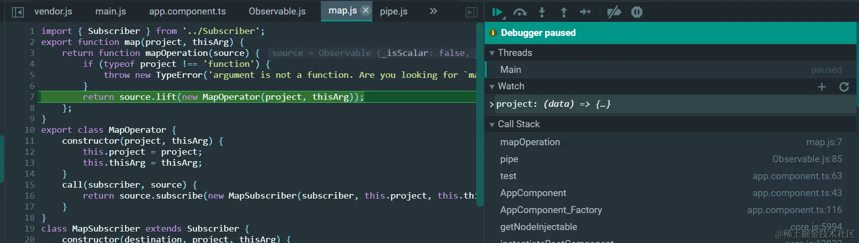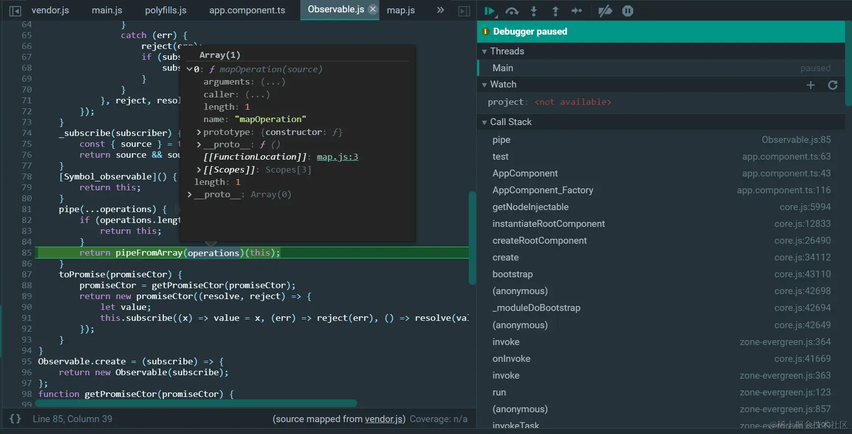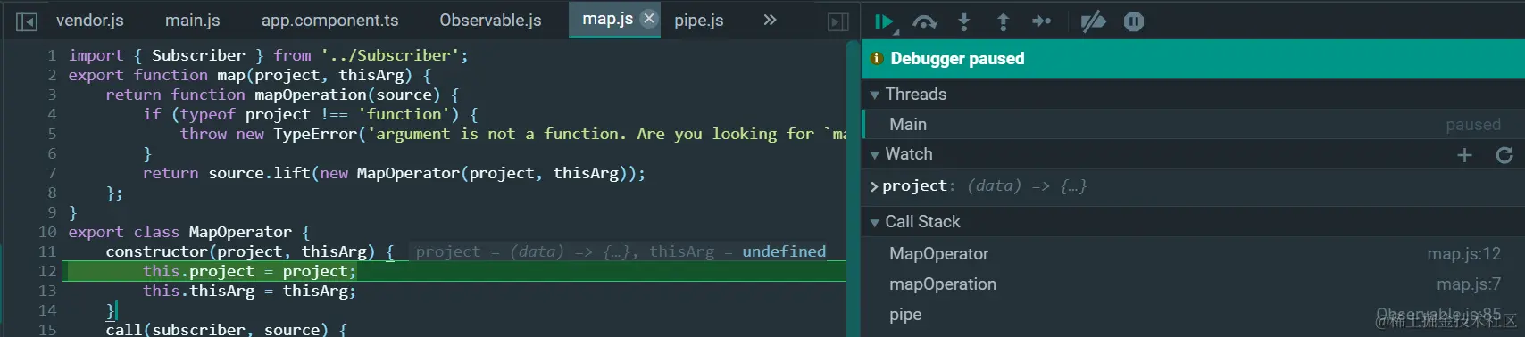 pipeFromArray(operations)返回operations数组里唯一的元素,即mapOperations,然后将this即当前调用pipe的Observable对象传入mapOperations函数: