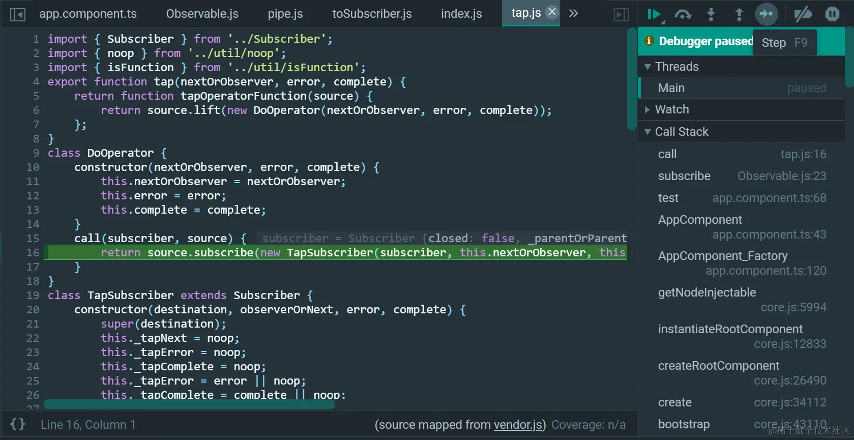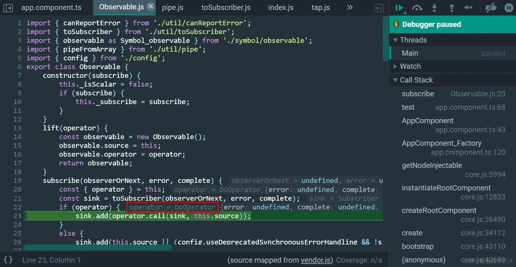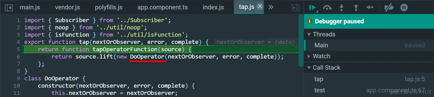this就是调用pipe的source Observable,作为输入参数source,传入tap返回的tapOperationFunction里: