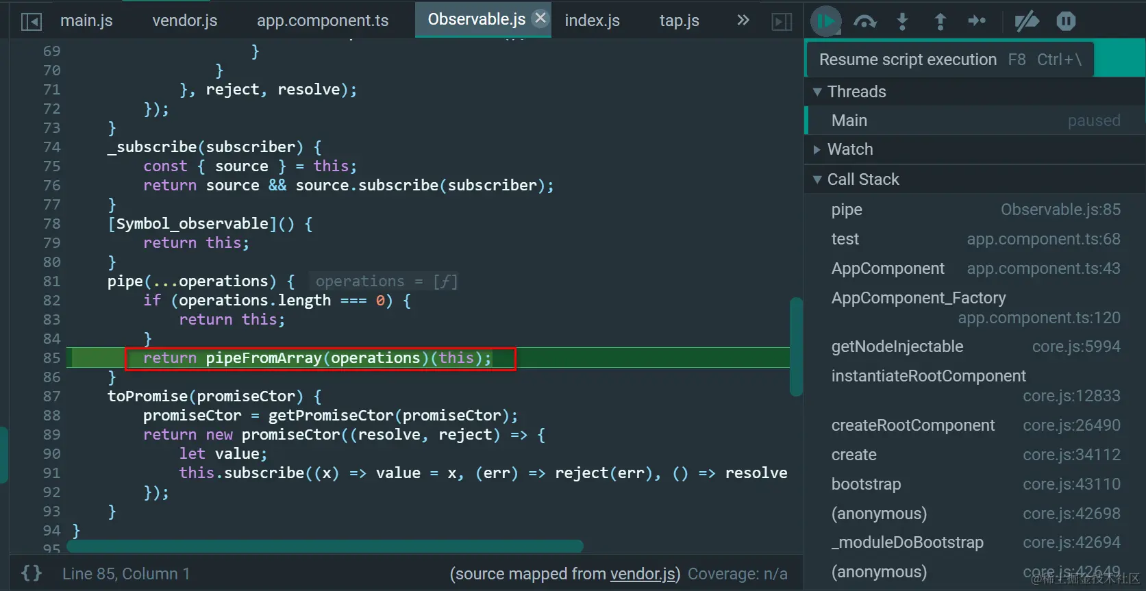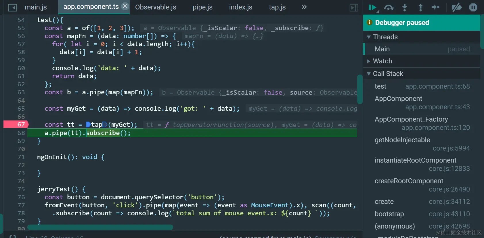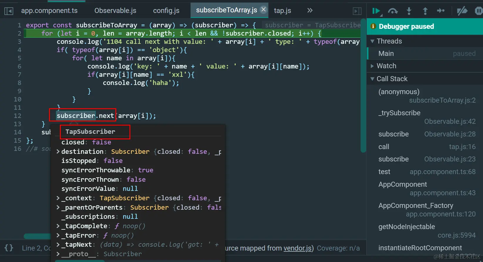 this就是调用pipe的source Observable,作为输入参数source,传入tap返回的tapOperationFunction里: