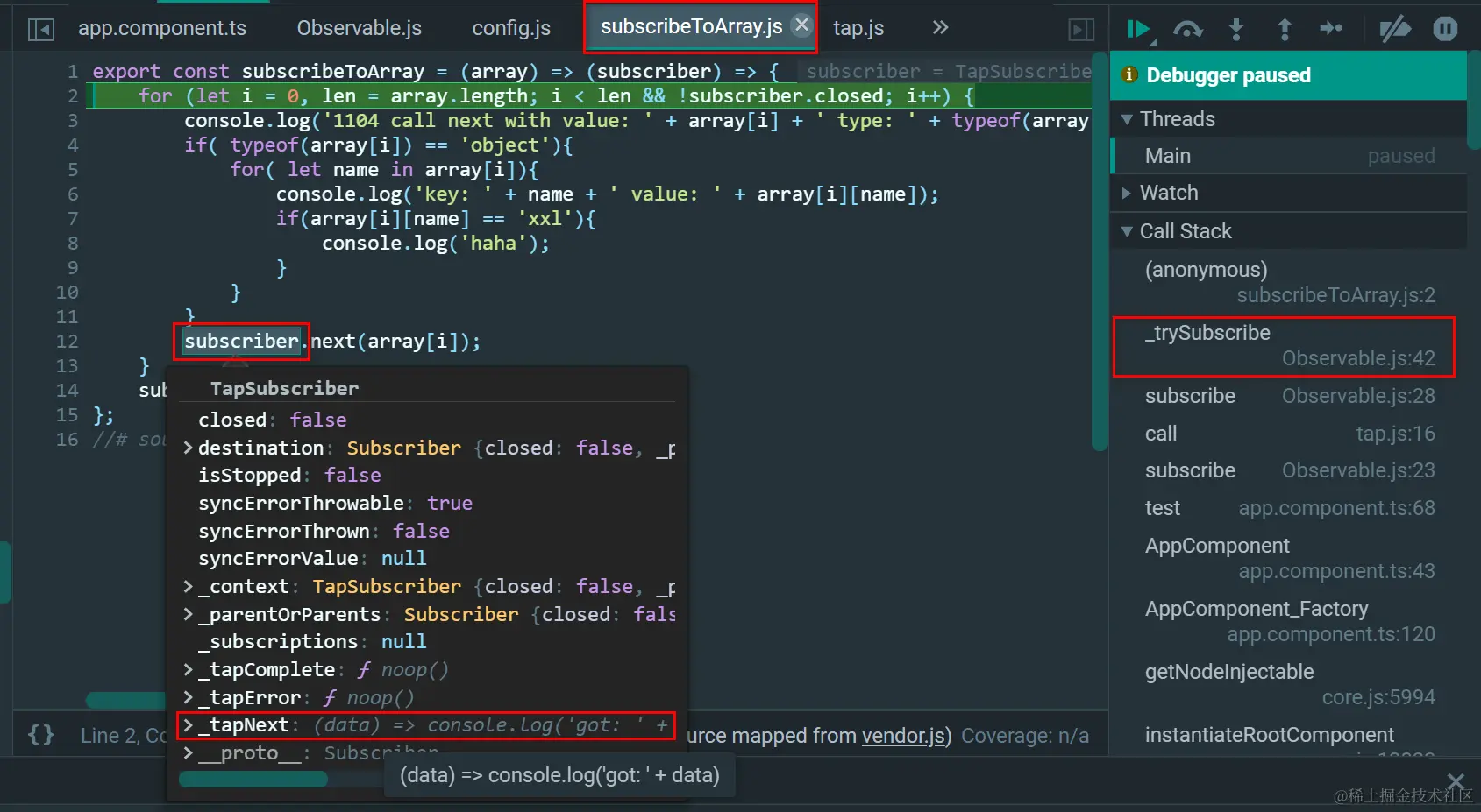 原始Observable调用subscriber的next方法,后者会调用_tapNext: