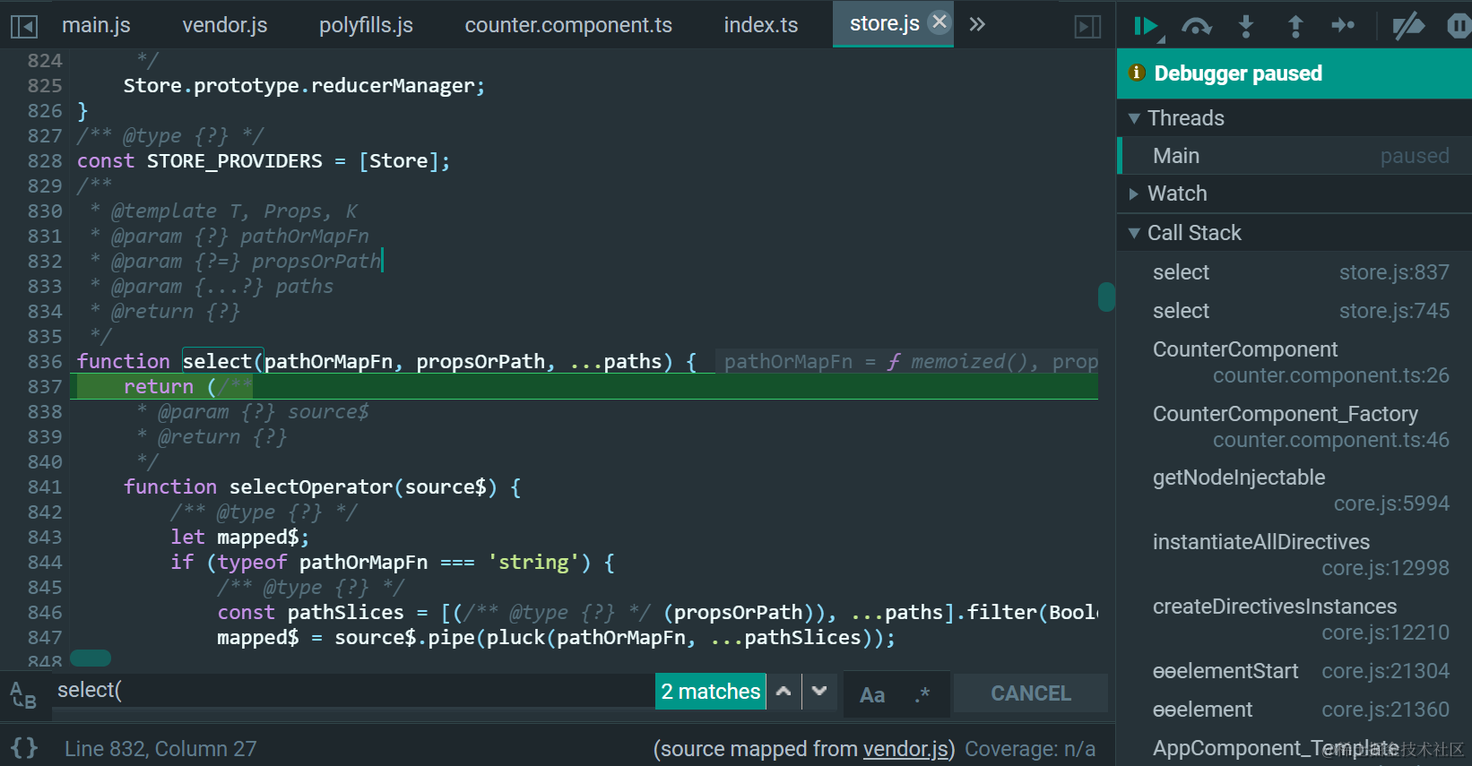 对于source store,执行map里指定的箭头函数,即我们应用程序传入store.select里的函数: