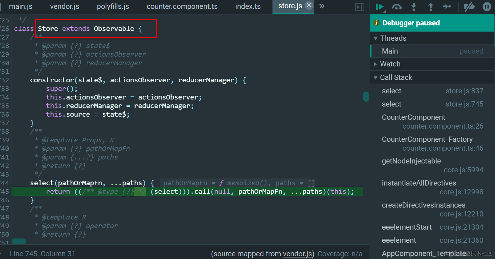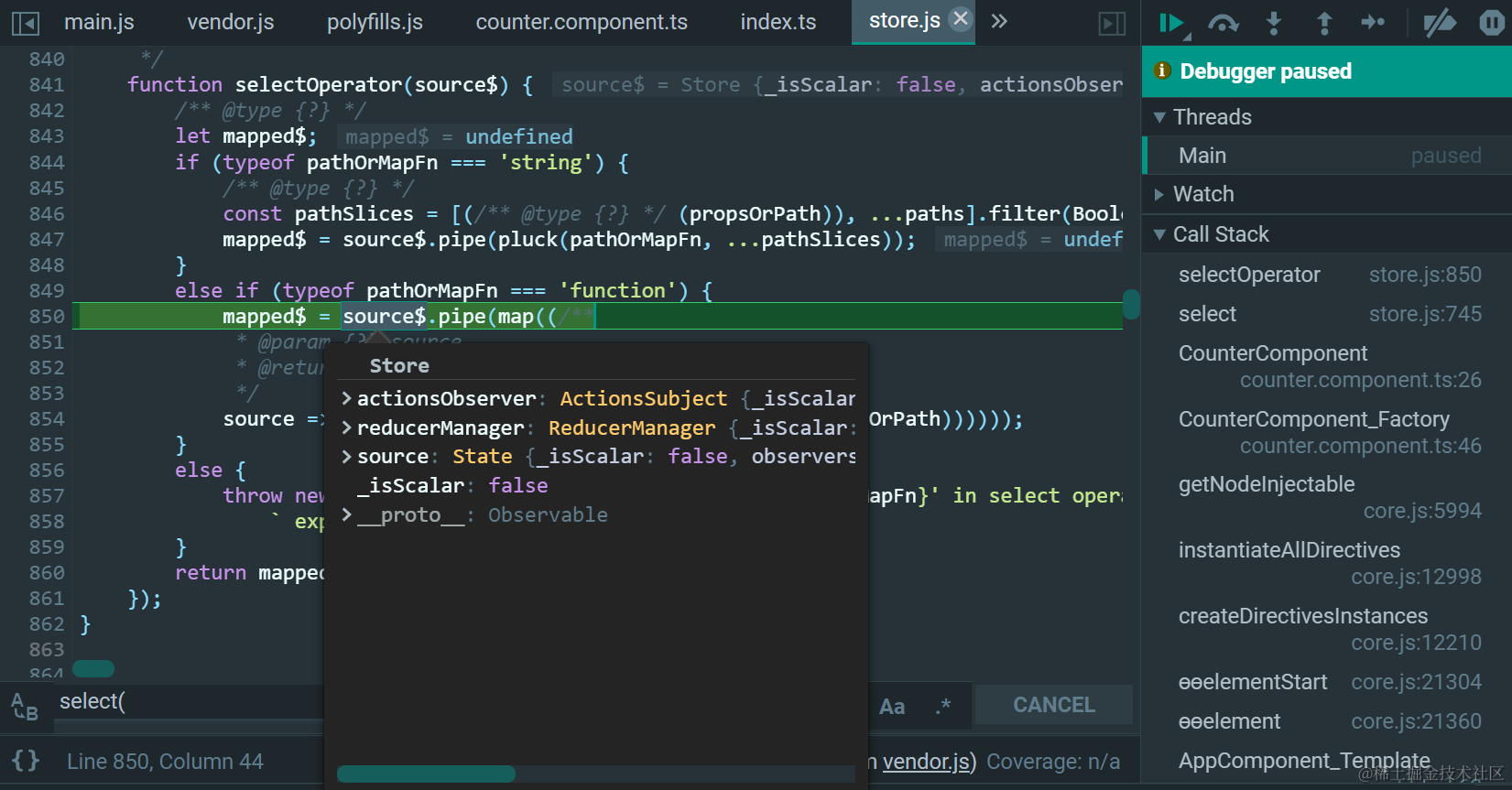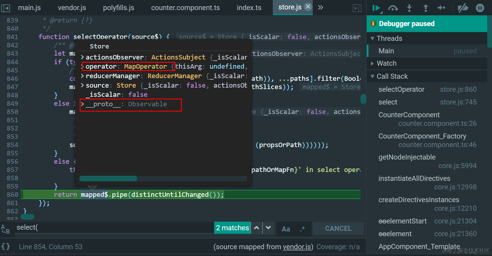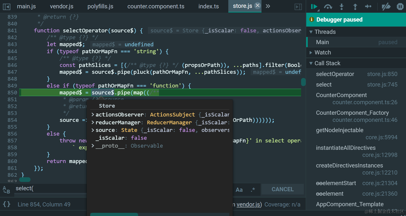 注意,Store是Observable的子类,这个select是Store的重新实现: