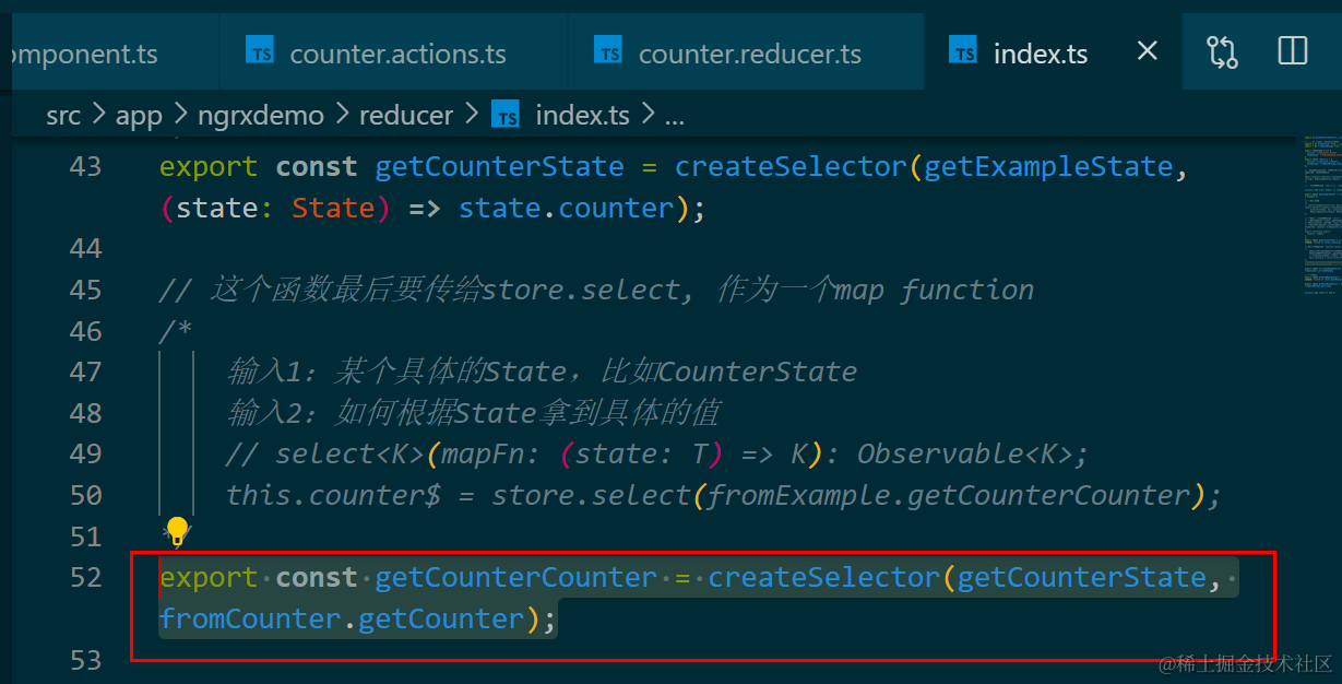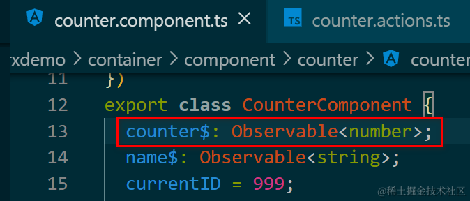 this.counter$ = store.select(fromExample.getCounterCounter);