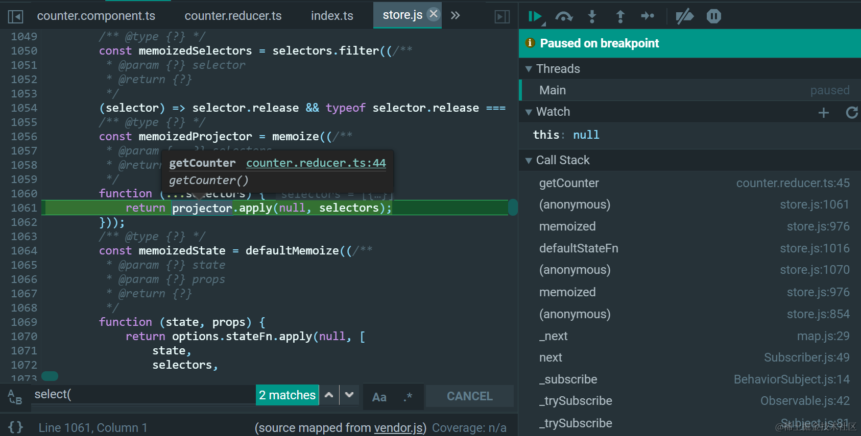 传入select方法的fromExample.getCounterCounter是一个createSelector返回的值: