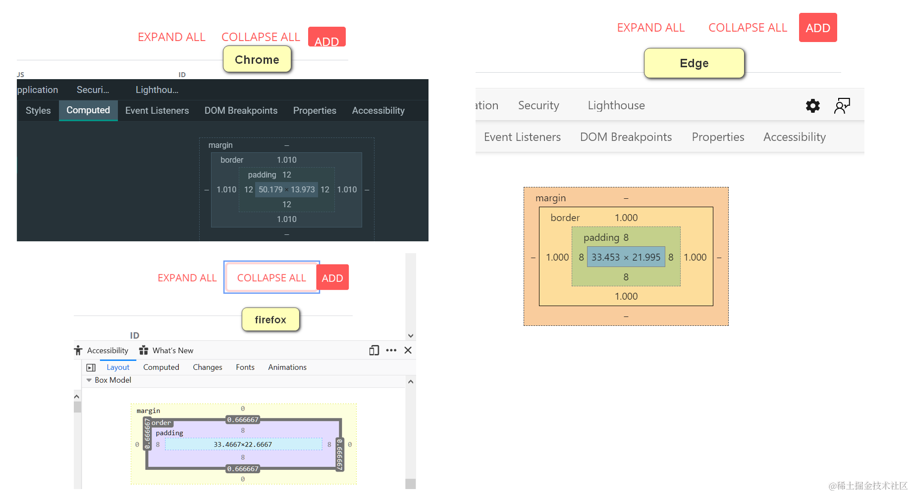 请大家注意下图红色的ADD按钮,分别是在最新版本的Chrome,Edge和firefox上渲染的效果。可以看出,在Chrome上渲染时,按钮上的ADD文本紧贴着按钮底部了,而Edge及firefox里渲染没这个问题。