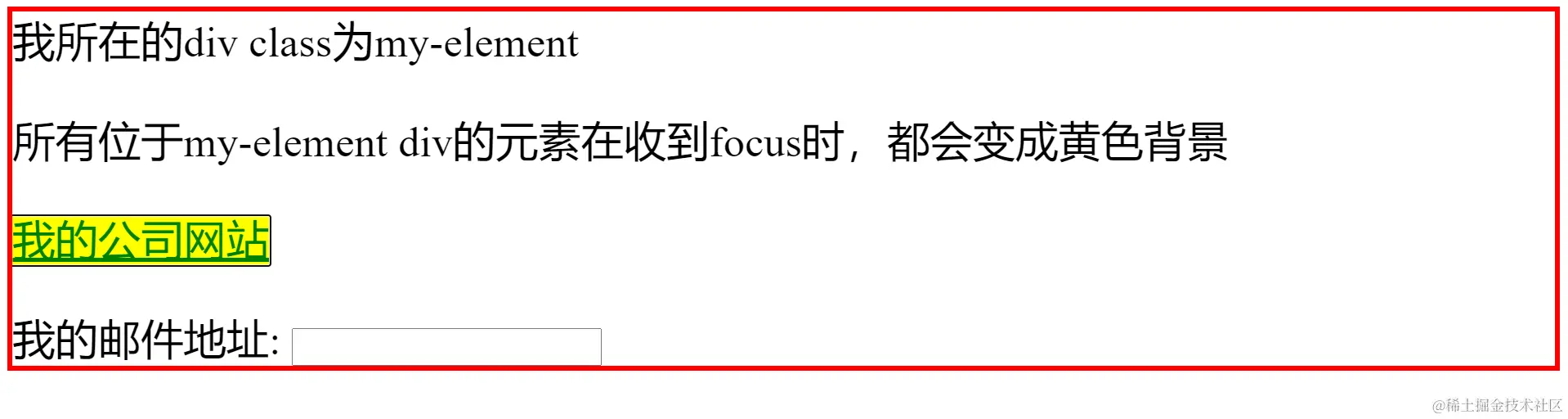 .my-element类修饰的div本身不会成为焦点,除非给它设置tabindex属性。但当div容器内部的子元素,比如链接a或input元素,成为焦点时,通过:focus-within这个伪类,我们会看到div元素本身会出现一个3px的边线(border).
