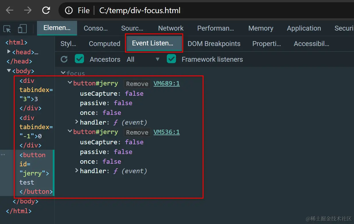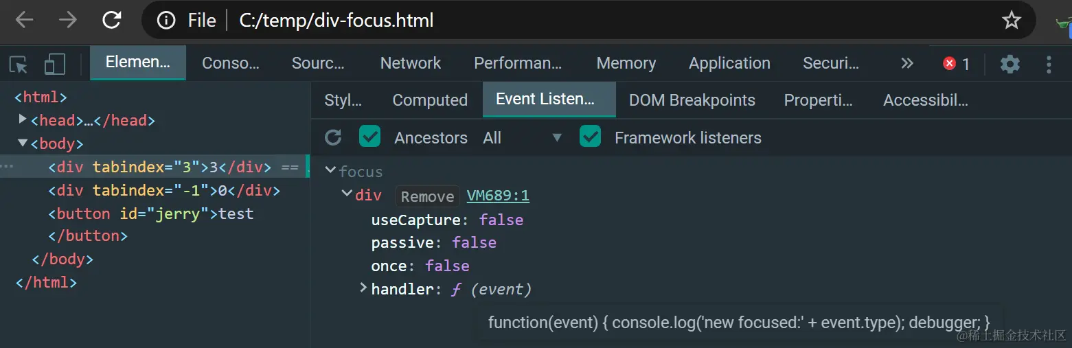 成功注册后,在Element的Event Listeners标签页里能看到这些函数: