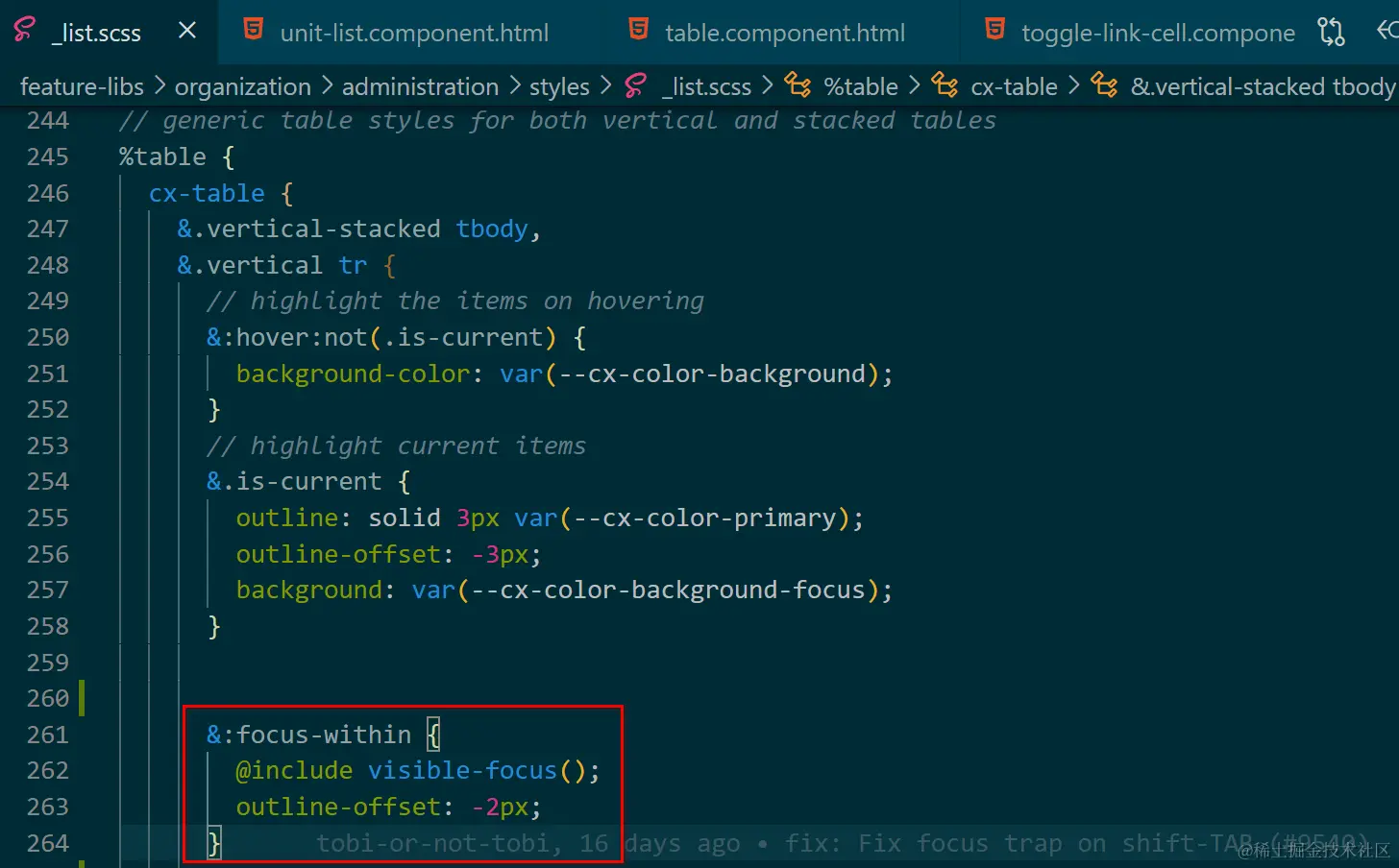 当行项目复合控件内的a标签被tab键focus之后,因为a标签的css设置,它本身会显示被focus的轮廓线效果。同时,a标签的父节点,tr标签设置了伪类focus-within, 其效果是,一旦tr有任意子节点得到focus, tr本身也会得到focus.