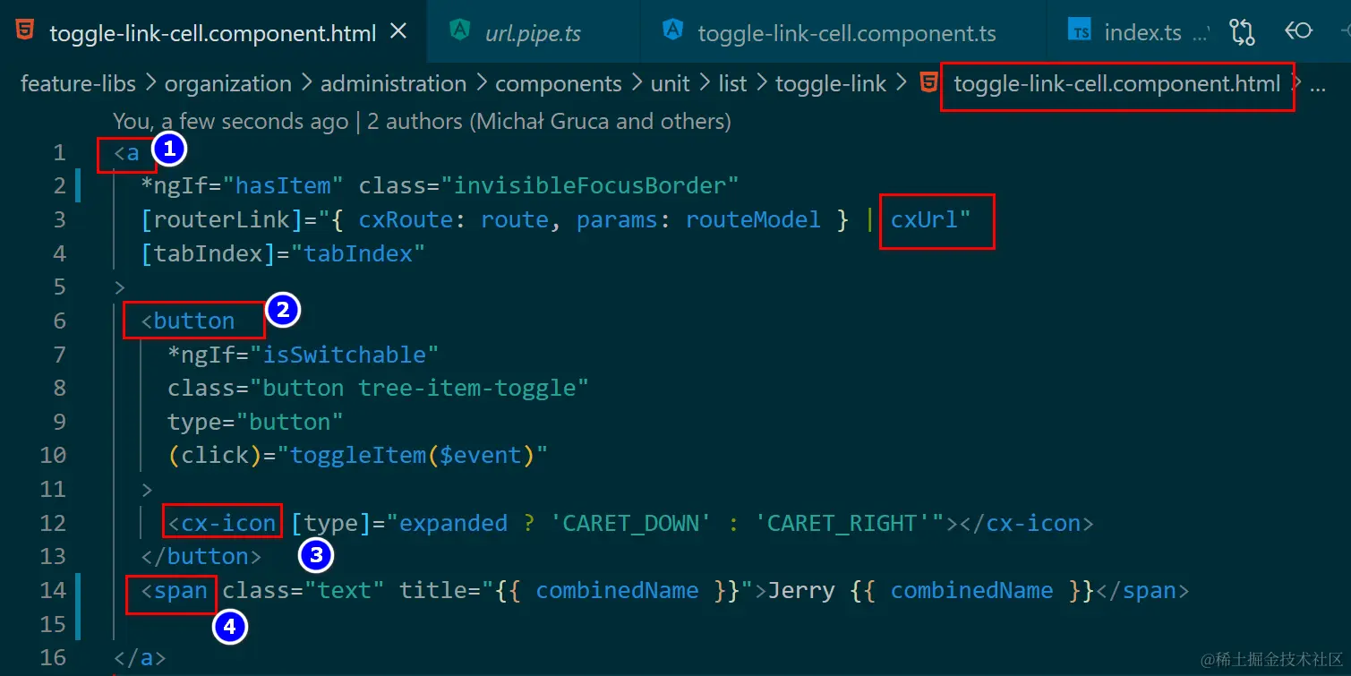 列表行项目第一列的实现,是一个自定义复合控件(Composite Control, SAP UI5也有类似概念,叫做Reusable Control), 由一个a标签和一个button标签构成,其中a标签通过自定义管道cxUrl在页面渲染时动态生成一个url, 指向该行项目对应的Organization Unit明细页面。当a标签持有focus时,鼠标点击或者回车键按下之后,跳转到Org Unit明细页面。