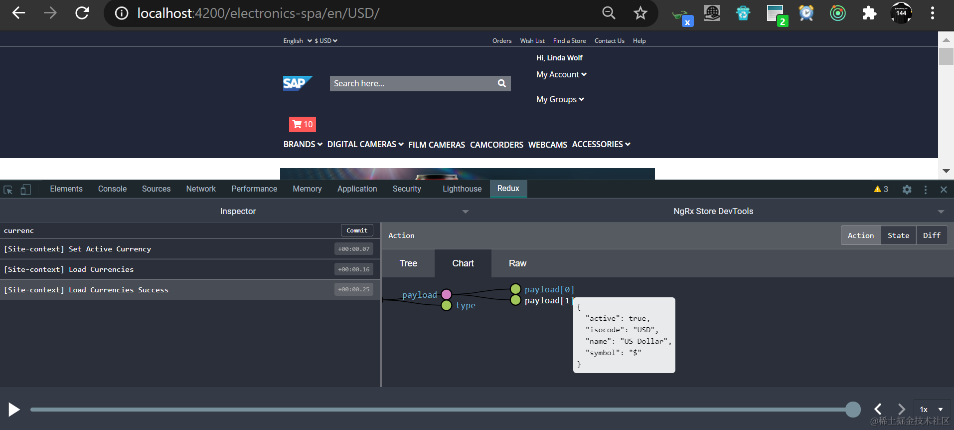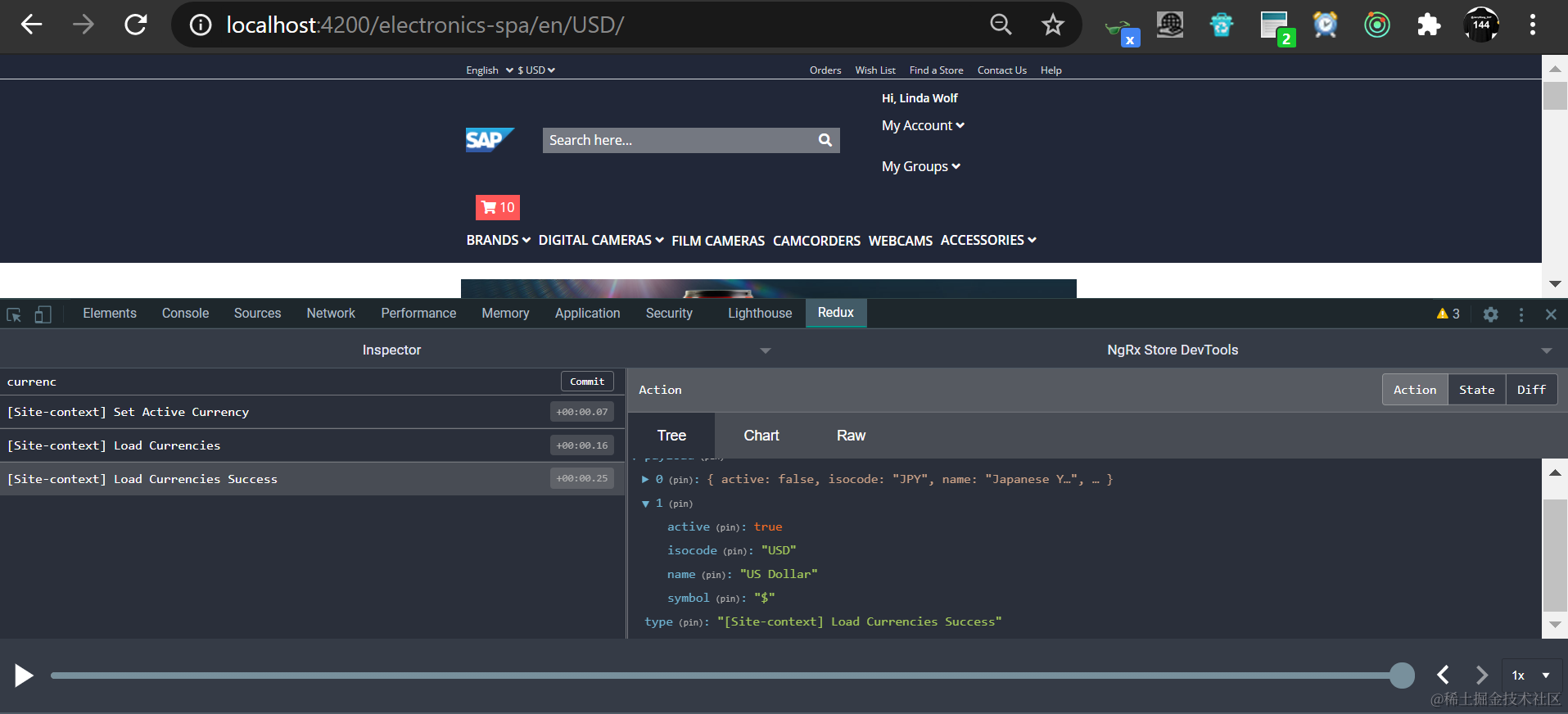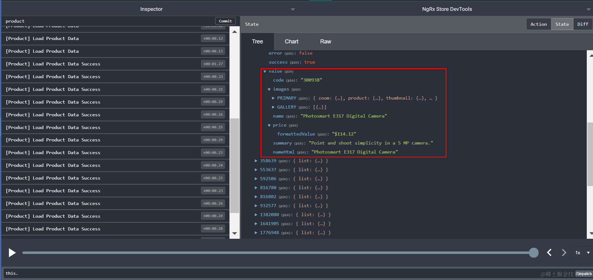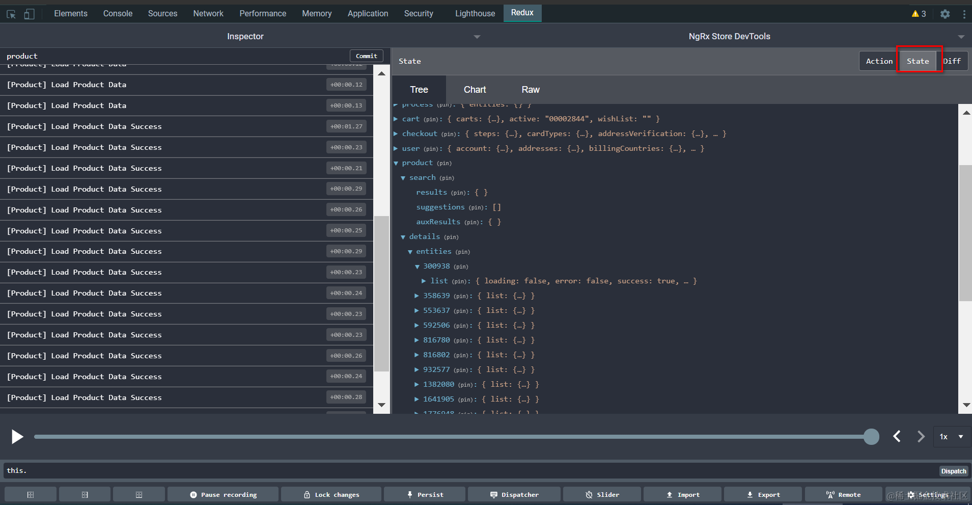 此时在redux面板里即可方便的查看ngrx相关的state和action: