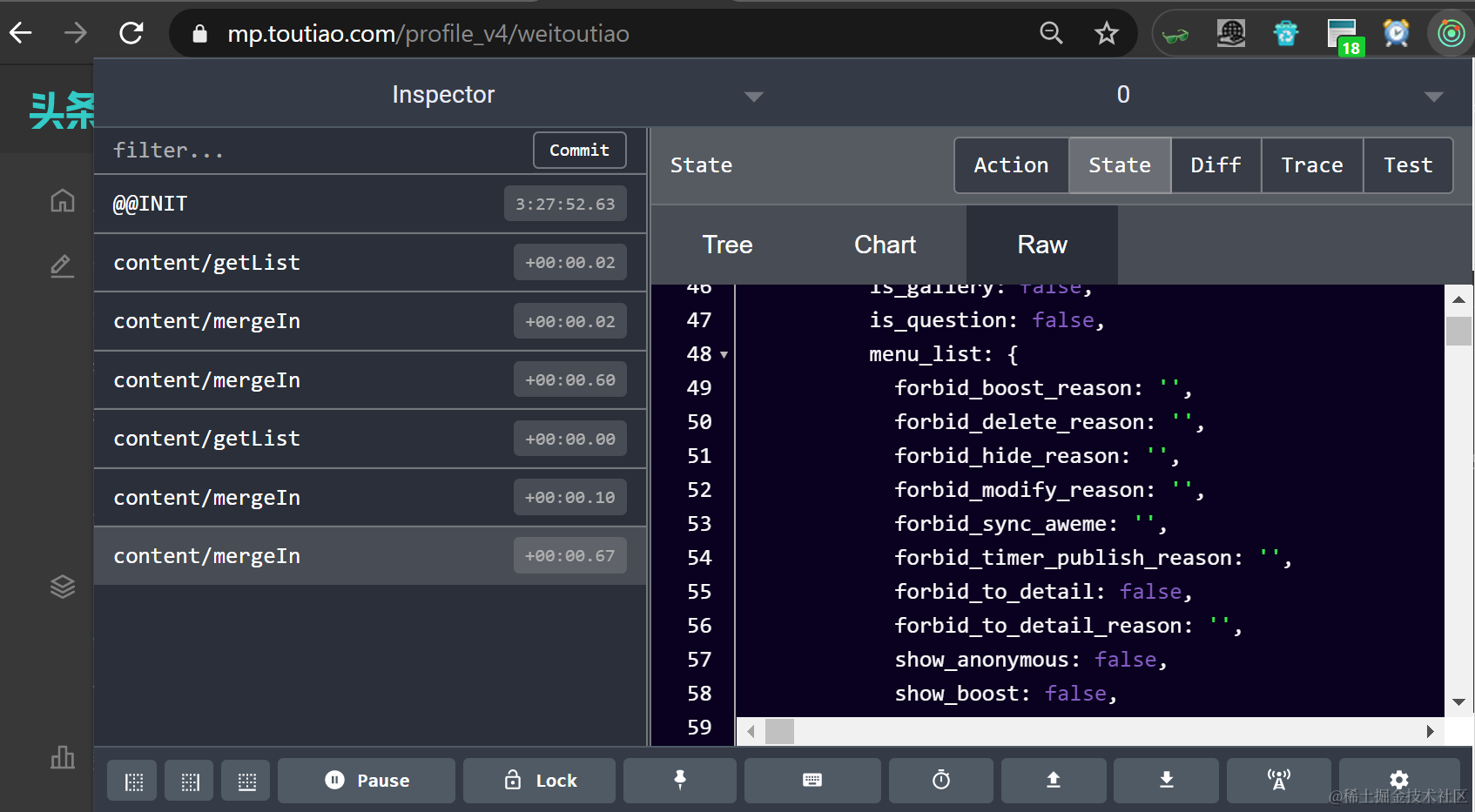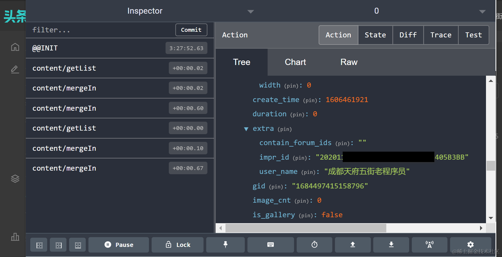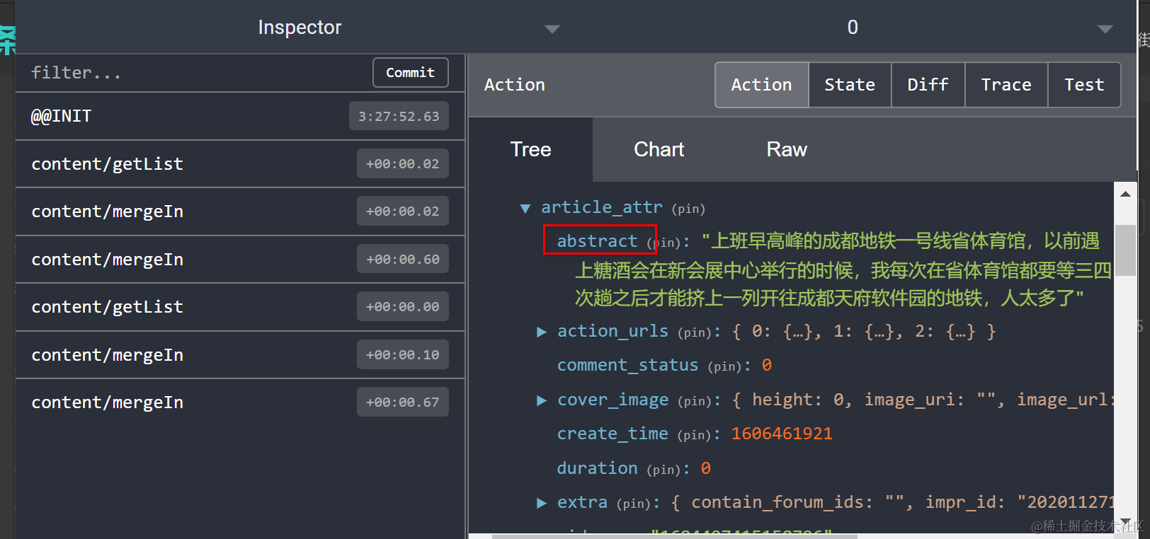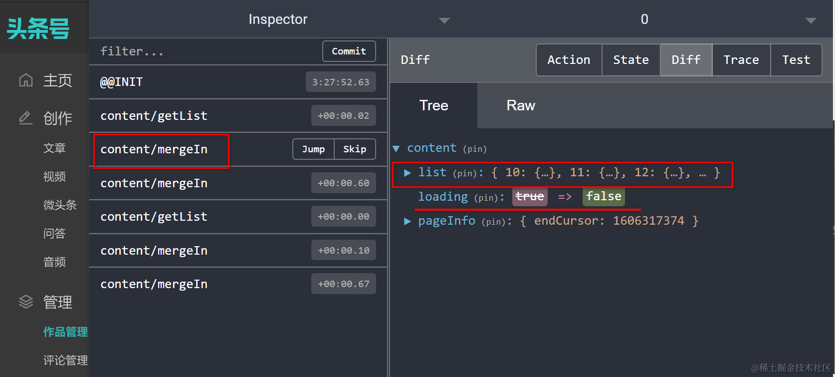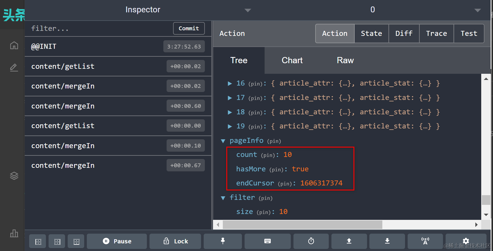 在content/mergeIn这个action的payload区域,内看到成功从头条后台服务器读取完毕的10条头条内容:loading状态从true变为false,说明加载完毕: