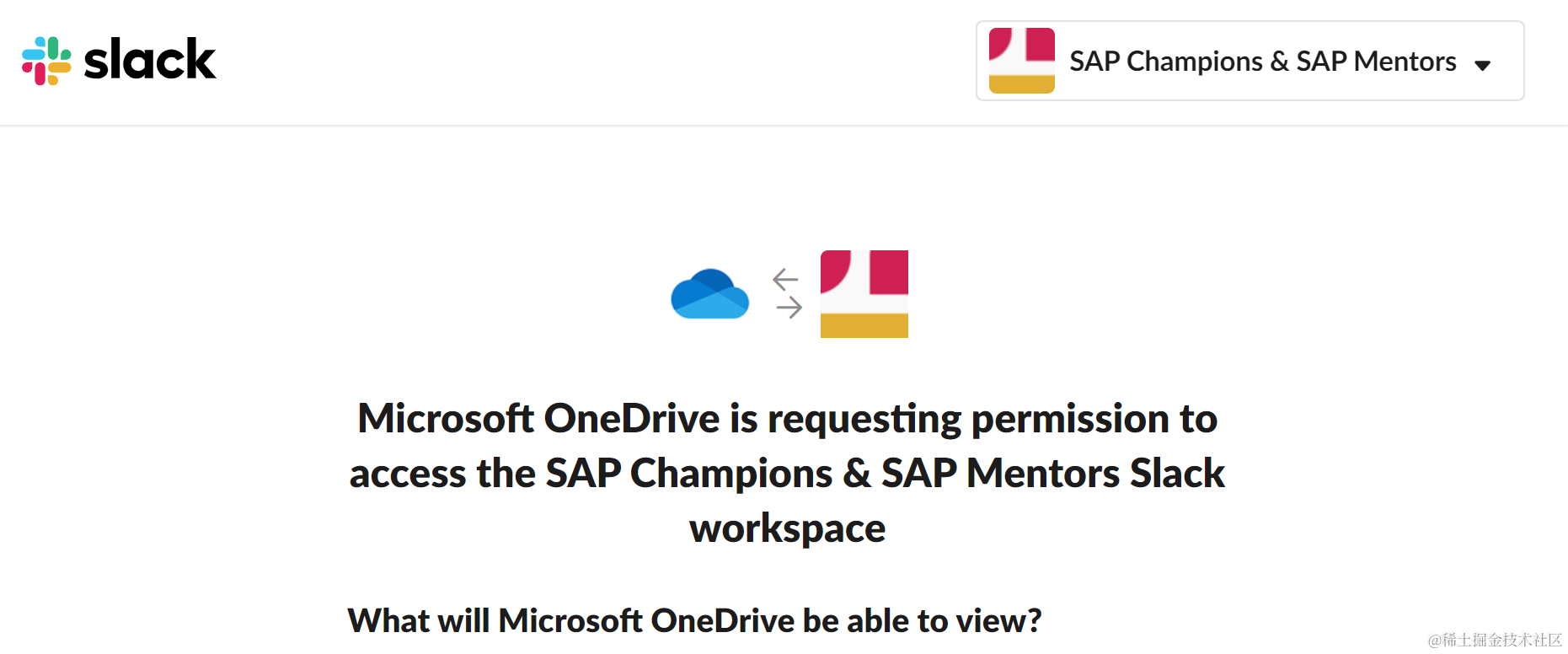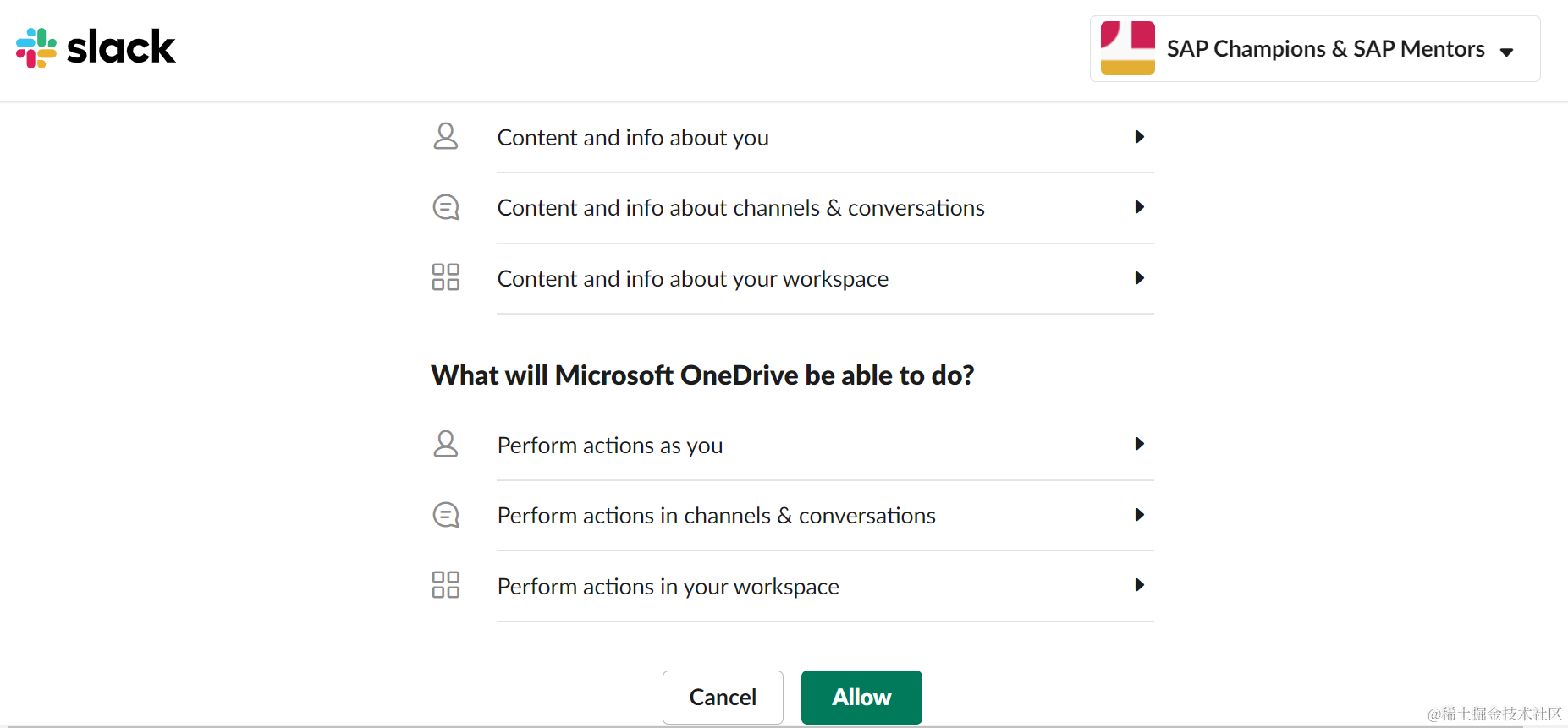 微软One Drive正在请求访问SAP Champions和SAP Mentor的slack workspace,询问用户是否赋予One drive该权限。
