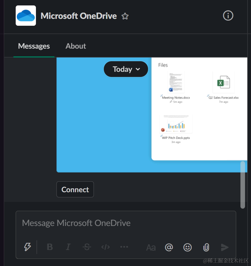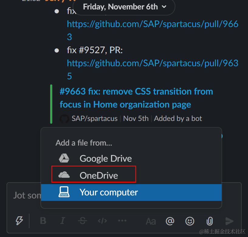 我们在Slack里连接微软One Drive之后,就可以在Slack里给其他人发送文件时,直接选择One Drive里的文件。
