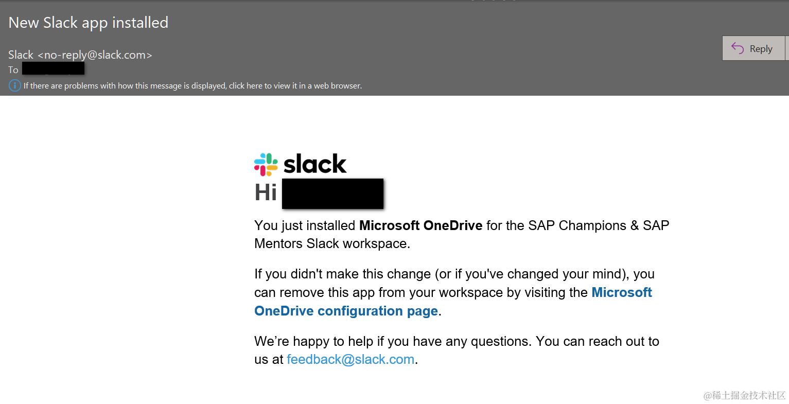 点击Allow之后,收到一封提示邮件,已经在Slack里成功安装了One Drive App:
