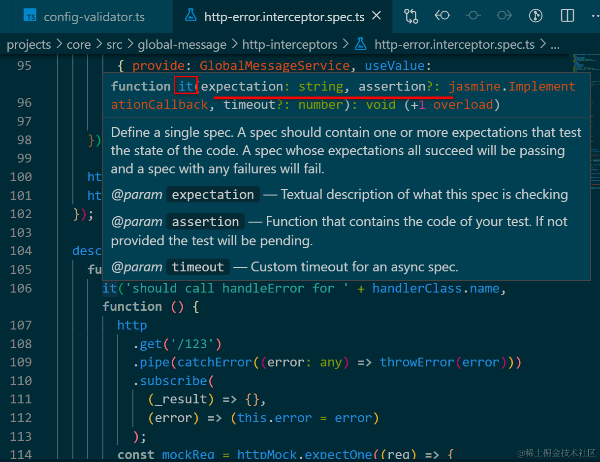 真正的spec由函数it创建:其中expectable是human readable的字符串描述信息,描述该spec具体要测试哪些东西,assertion就是具体的包含单元测试的代码。