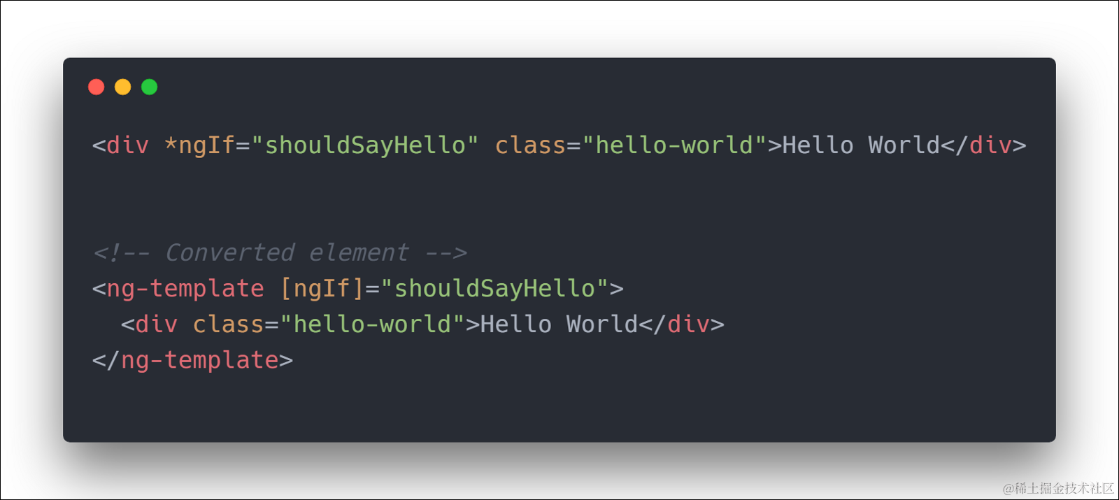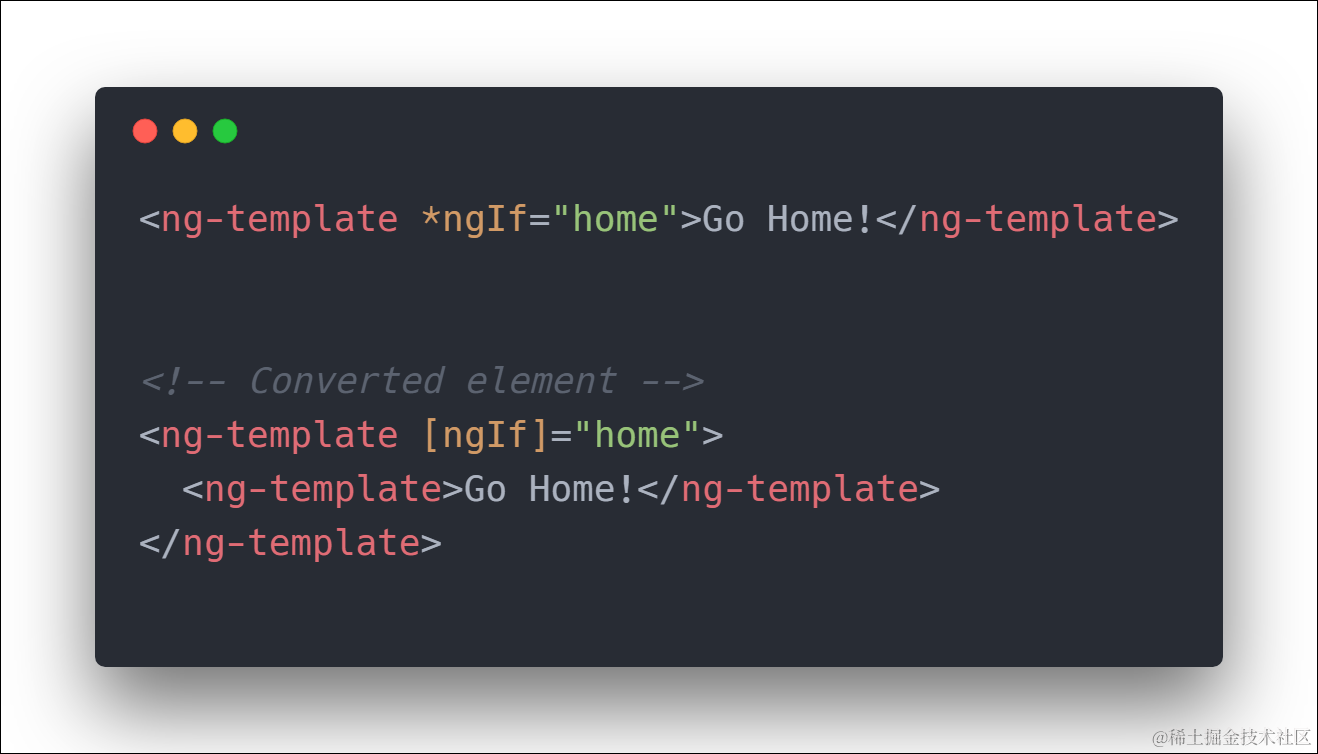 结构化指令施加的元素称为host元素,host元素被ng-template包裹,当Angular渲染页面时,会消费ng-template, 并在最终生成的DOM元素中加上一些diagnostic comment.