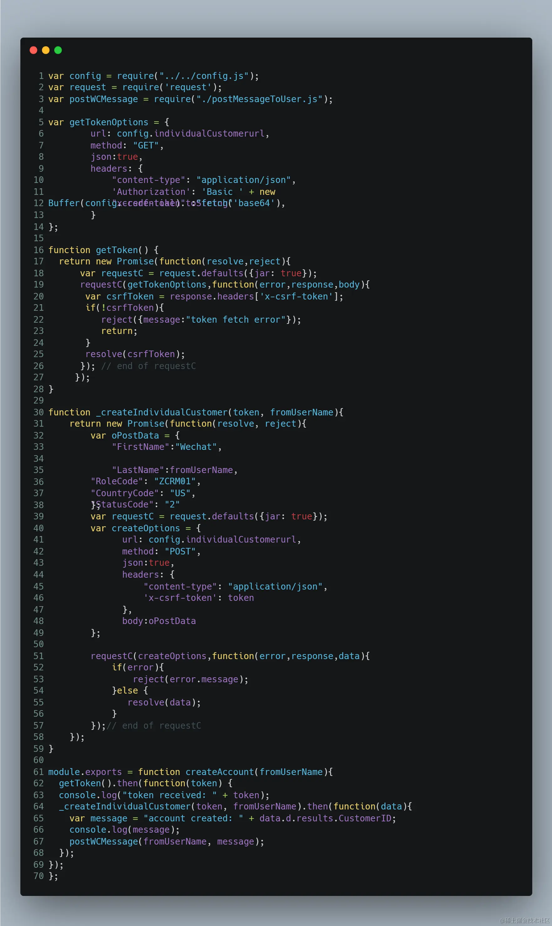 因为涉及到C4C数据的创建操作,需要使用HTTP POST,因此在真正调用C4C客户主数据创建API(上图第64行)之前,需要先调另一个API,拿到XSRF token(上图第62行的getToken).